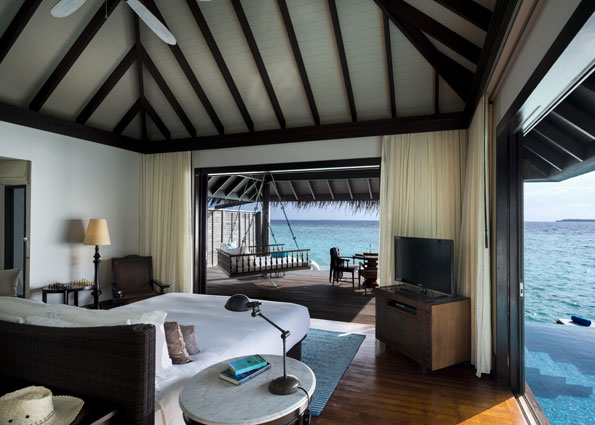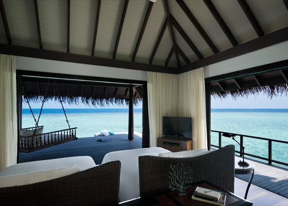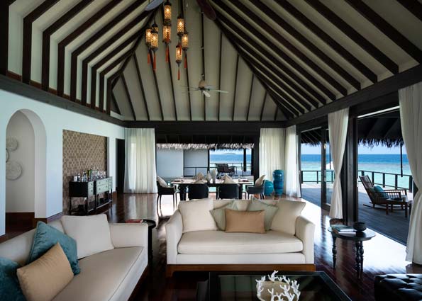 此房型以宁静的蓝色和绿色为基调,采用抛光木质室内装潢,拥有户外沙发床、宽敞明亮的起居室,是期望入住豪华水上别墅的客人的理想选择。 傍晚时分,在水上用餐亭享用私人日落晚餐——脚下黑影一闪,姿态优雅的毯魟游过地板的海景玻璃下面。 每栋水上小屋都专门配备私人管家,一天24小时随时待命,提供贴心服务。