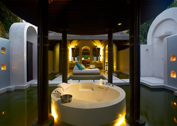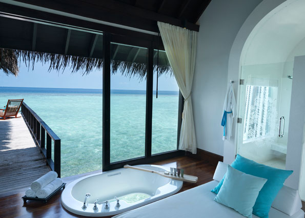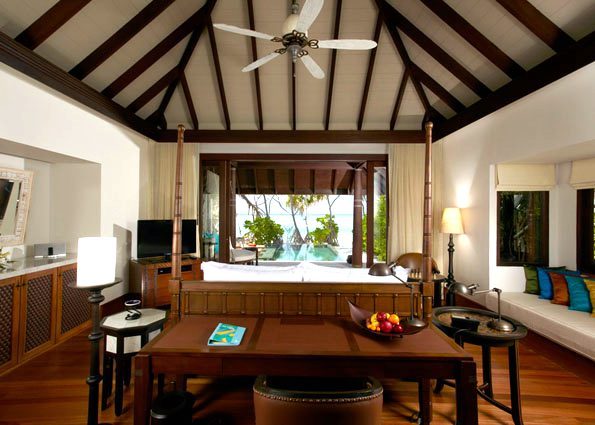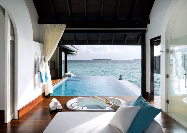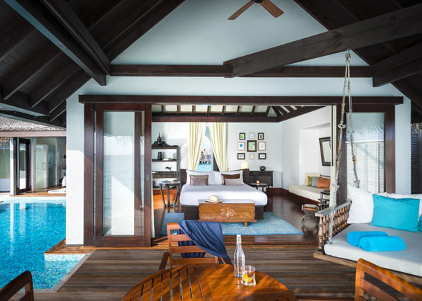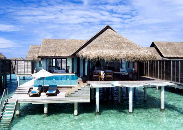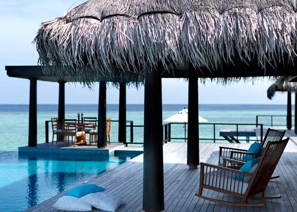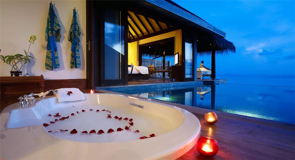 ①. 每个房间都是带私人无边泳池的豪华别墅,有免费无线网络连接,周围环绕着珊瑚礁和蓝色泻湖,拥有精致的家具,每栋别墅里面设施以及生活用品齐全。