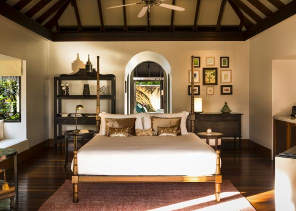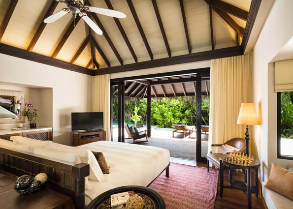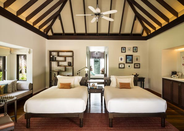 别墅主卧室拥有豪华的特大双人床,浴室设有室内和户外沐浴,以及嵌入浅水池中的露天浴缸。第二间卧室拥有两张单人床和一张沙发床,相连的第二间浴室设有半室内和户外淋浴。两间卧室皆通往宽敞的日光甲板,一家人可以在躺椅上休憩,在四面敞开的用餐亭中共享美食,或是在延展至白色柔软沙滩的大型无边泳池玩耍。