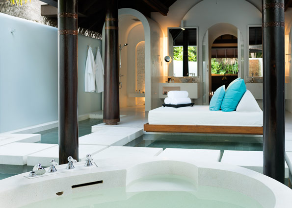 别墅浴室的尽头有个浅浅的池塘,沉浸在双人浴池中,仰望点点繁星。 躺在私人大型泳池水面上的躺椅晒太阳。别墅就在沙滩上,与泰国丝绸、淳朴的颜色和典雅的木质家具相得益彰。从Bose音响系统和冰酒器,到iPod基座和特浓咖啡机,海滨泳池别墅的设计极尽奢华和舒适。