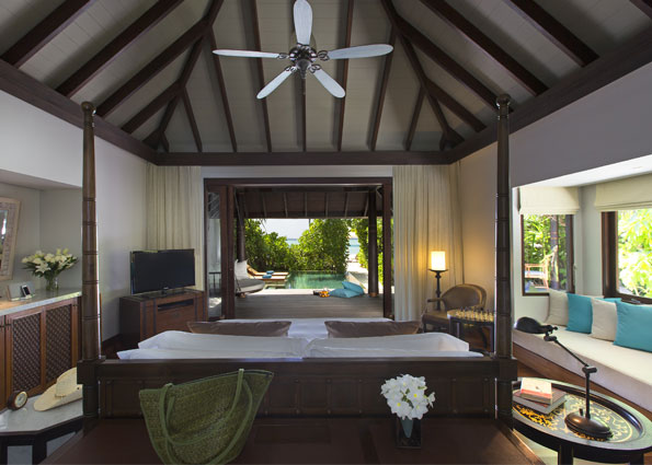 别墅主卧室拥有豪华的特大双人床,浴室设有室内和户外沐浴,以及嵌入浅水池中的露天浴缸。第二间卧室拥有两张单人床和一张沙发床,相连的第二间浴室设有半室内和户外淋浴。两间卧室皆通往宽敞的日光甲板,一家人可以在躺椅上休憩,在四面敞开的用餐亭中共享美食,或是在延展至白色柔软沙滩的大型无边泳池玩耍。