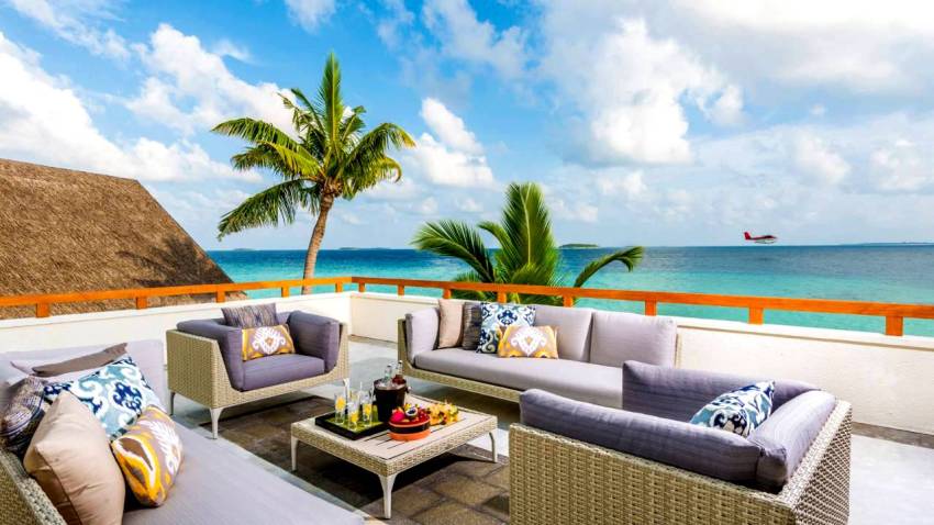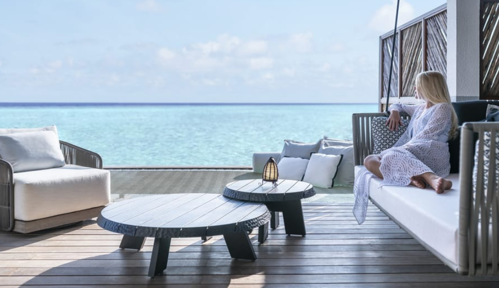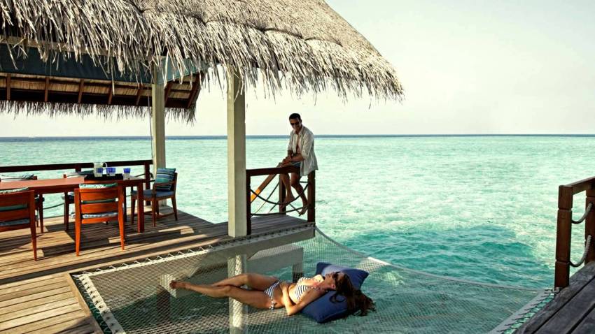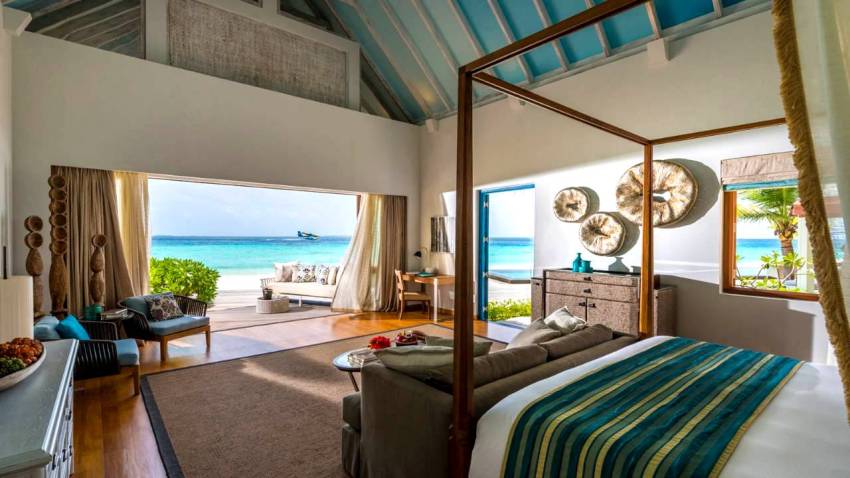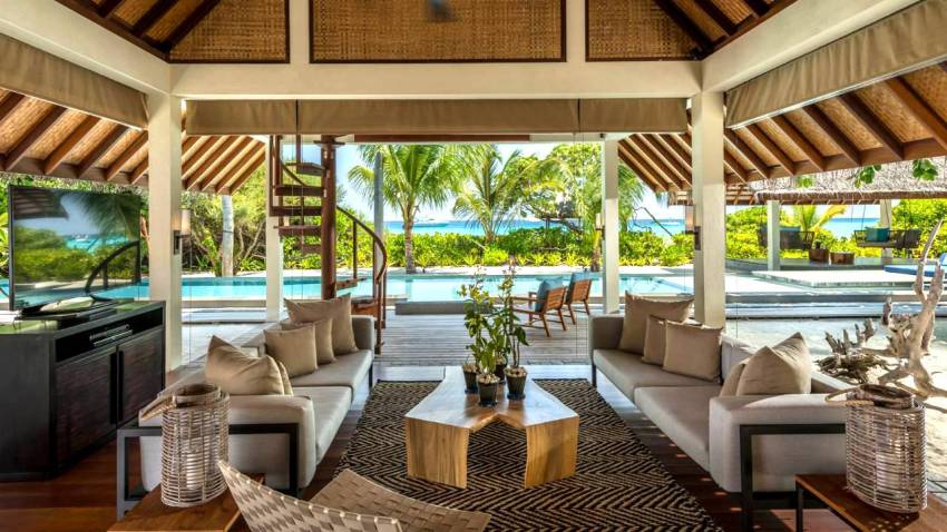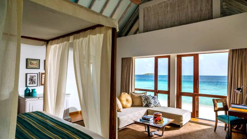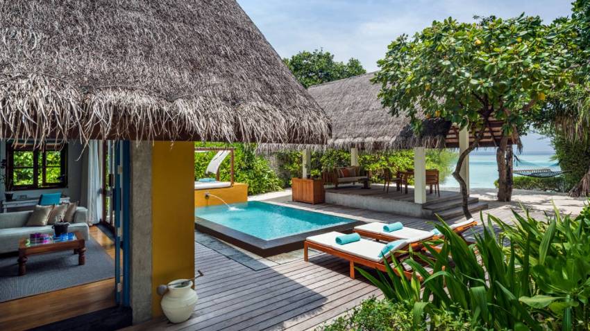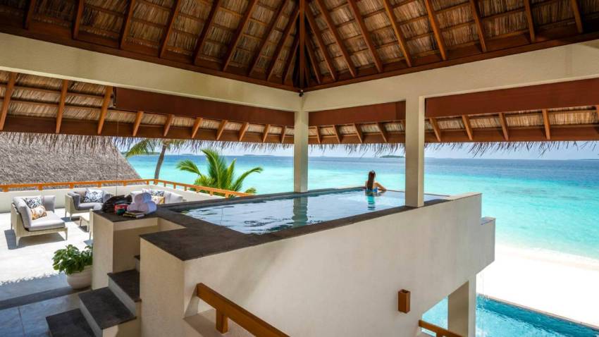 入住马尔代夫兰达吉拉瓦鲁岛四季度假酒店的海景小屋,在郁郁葱葱的热带花园中一览礁湖美景,享受与大自然亲密接触的非凡乐趣。(备注:此沙屋前面沙滩很小)
