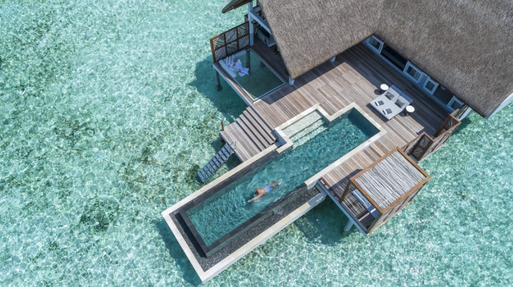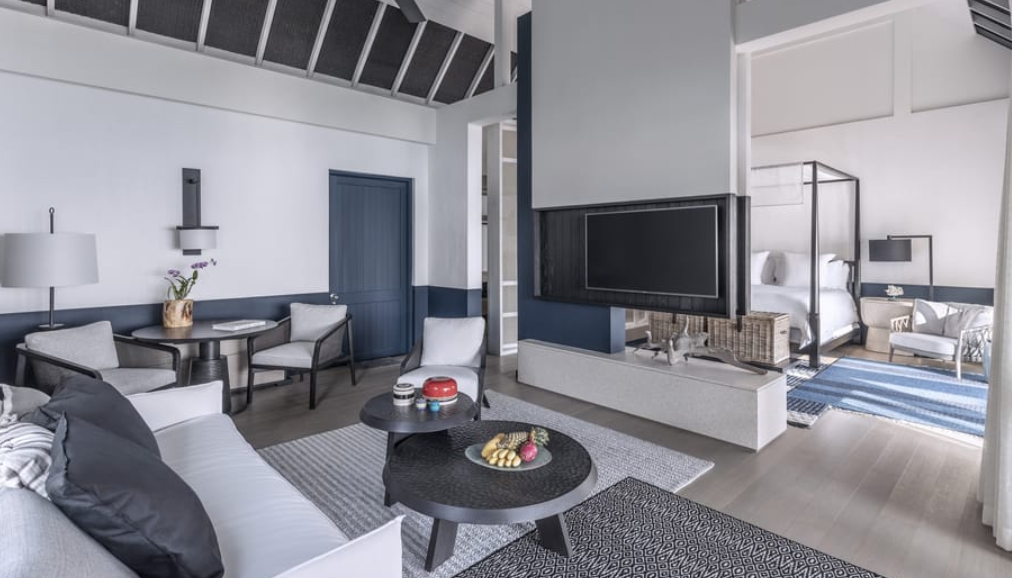 房型介绍:双卧室海陆双景套房不仅配备超大私人泳池、水上吊床、海景用餐平台,并设有通往泻湖的阶梯,而且靠近色彩绚丽的Yin and Yang珊瑚花园。