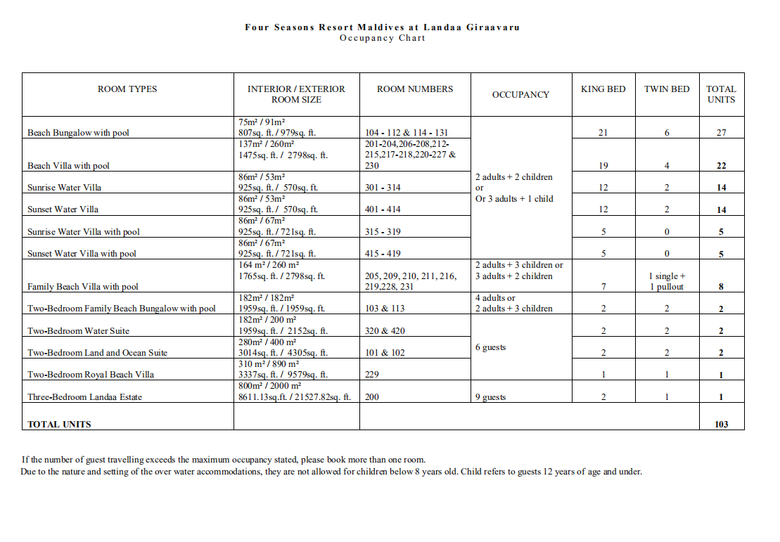 | 水日出/日落双卧室水上套房--Sunrise/Sunset Two-Bedroom Water Suite | 2 | 182平 | √ | 6大 / 4大2小 |