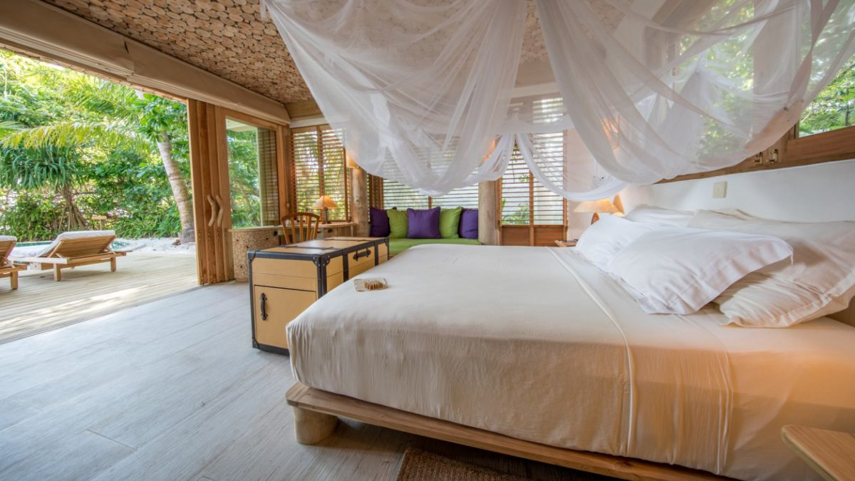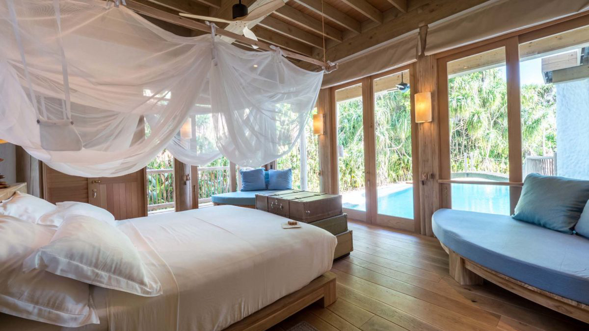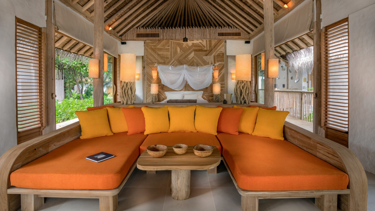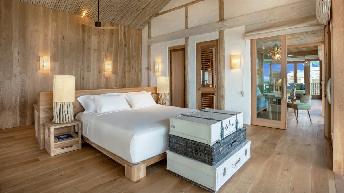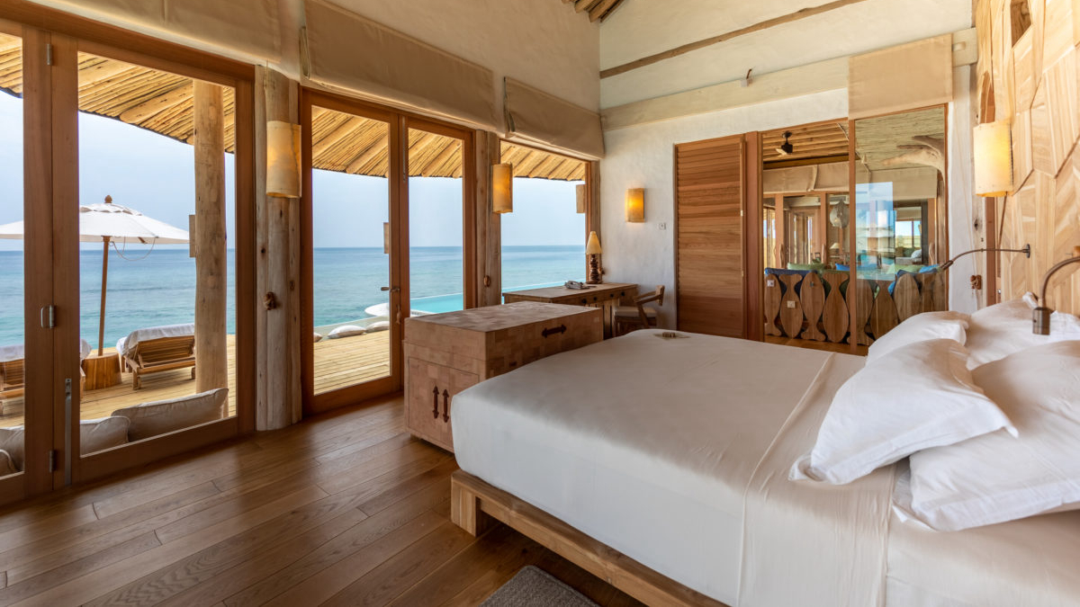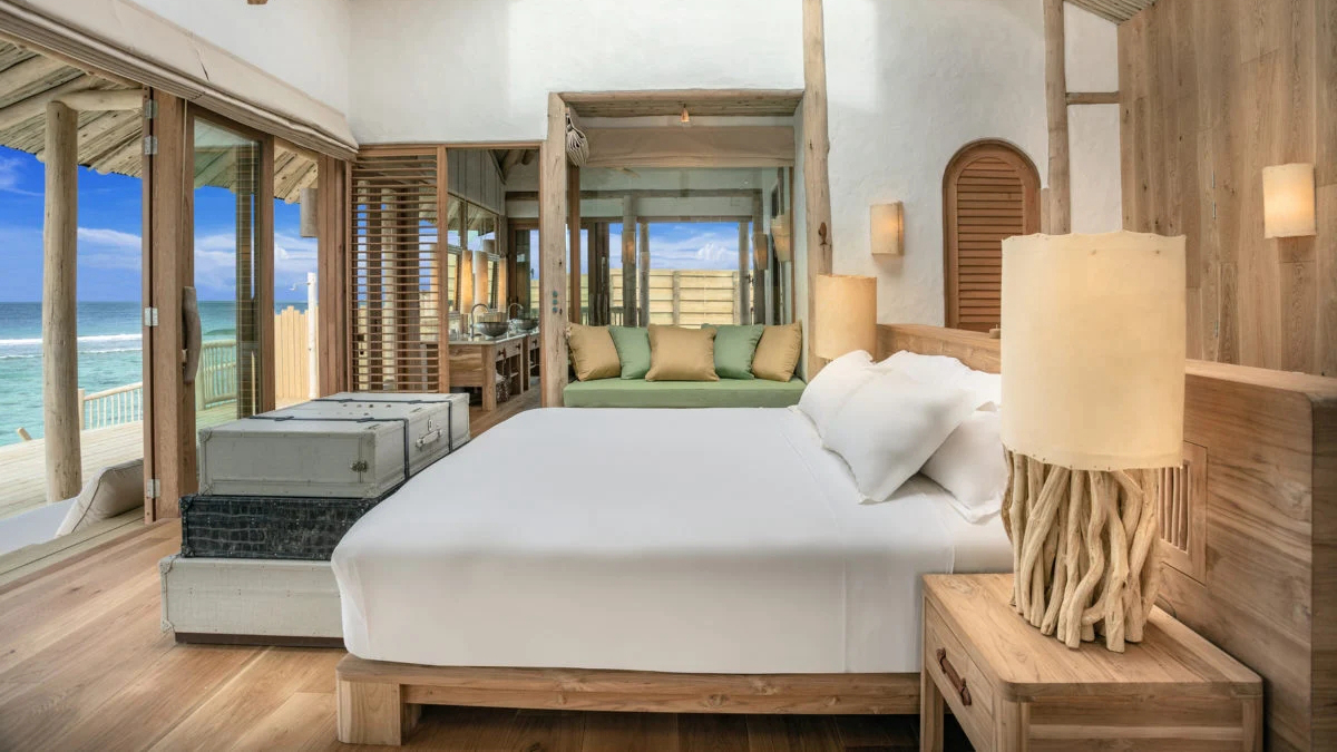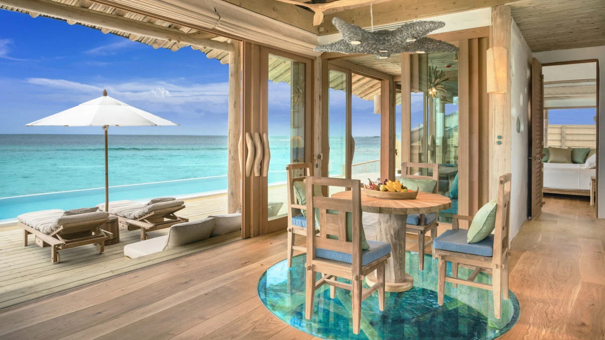 从观景台上沐浴在夜空中。你的别墅套房就在海滩上,有自己的阳台通向温暖的沙滩。沉入四柱床,而开放式客厅通过落地玻璃窗将室外带入室内。