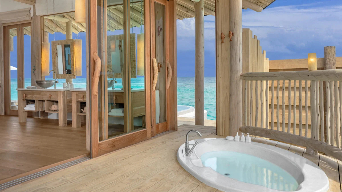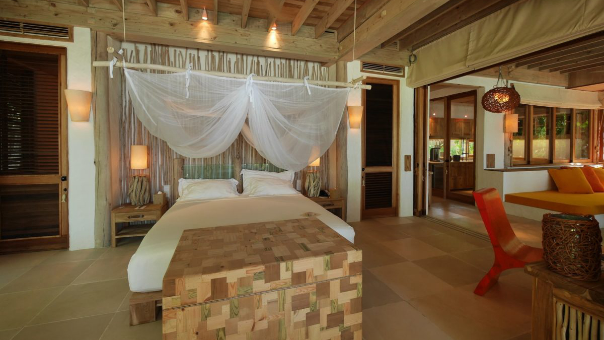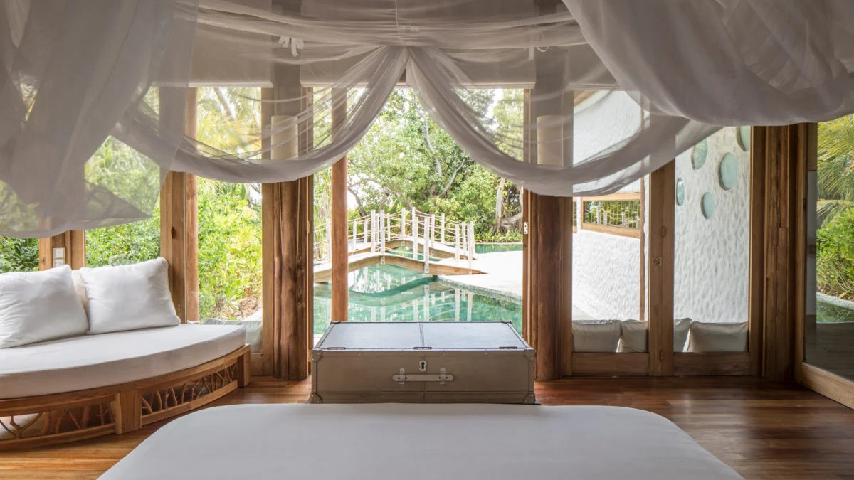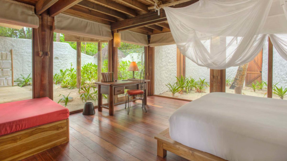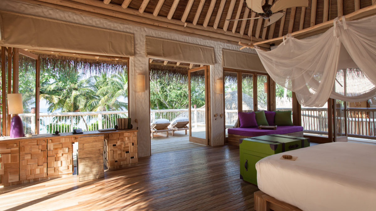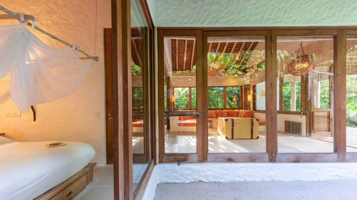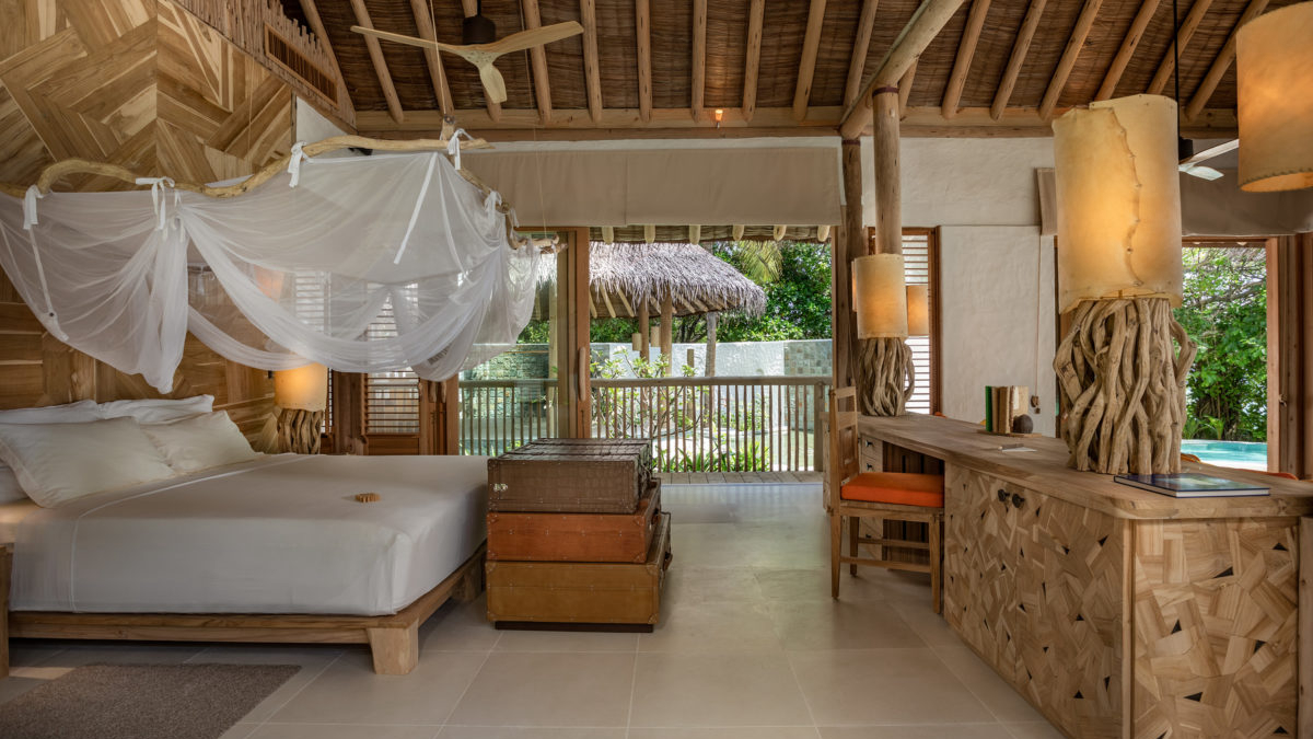 从观景台上沐浴在夜空中。你的别墅套房就在海滩上,有自己的阳台通向温暖的沙滩。沉入四柱床,而开放式客厅通过落地玻璃窗将室外带入室内。
