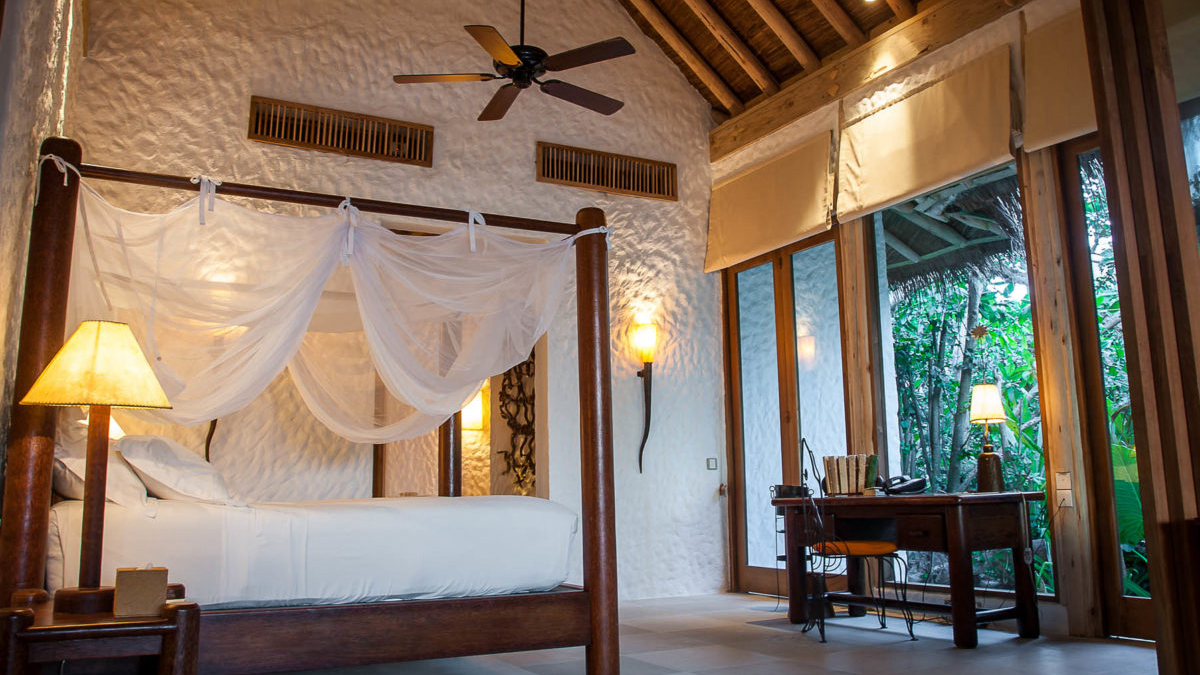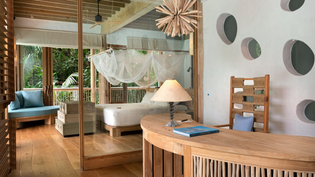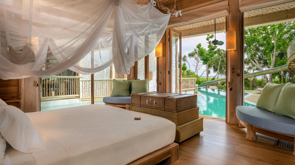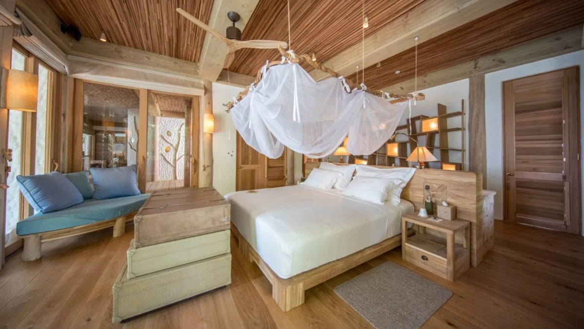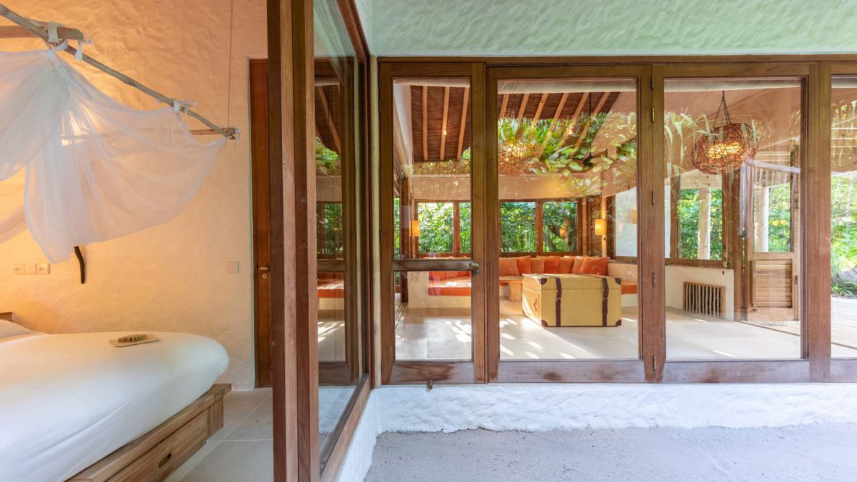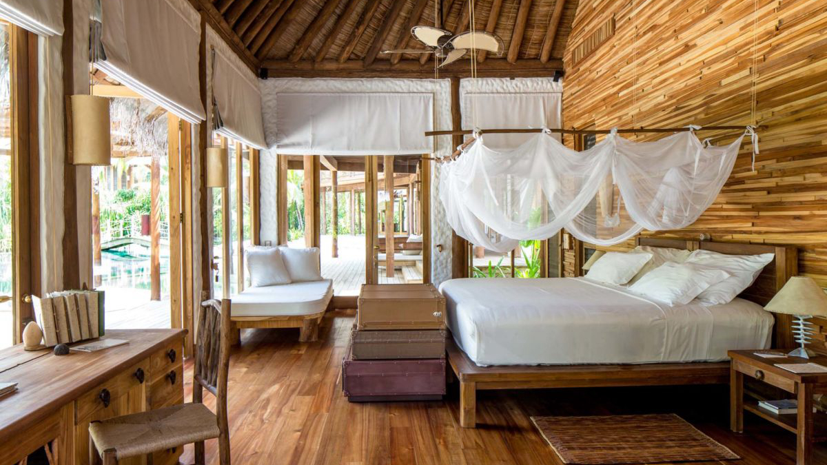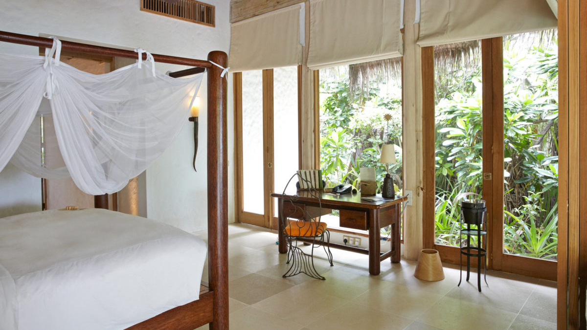 从观景台上沐浴在夜空中。你的别墅套房就在海滩上,有自己的阳台通向温暖的沙滩。沉入四柱床,而开放式客厅通过落地玻璃窗将室外带入室内。