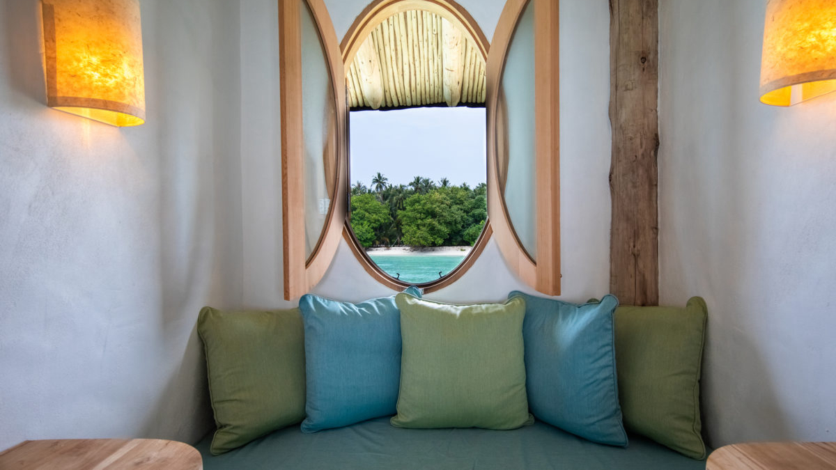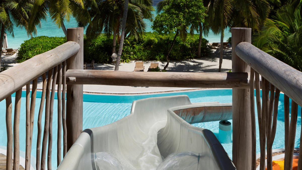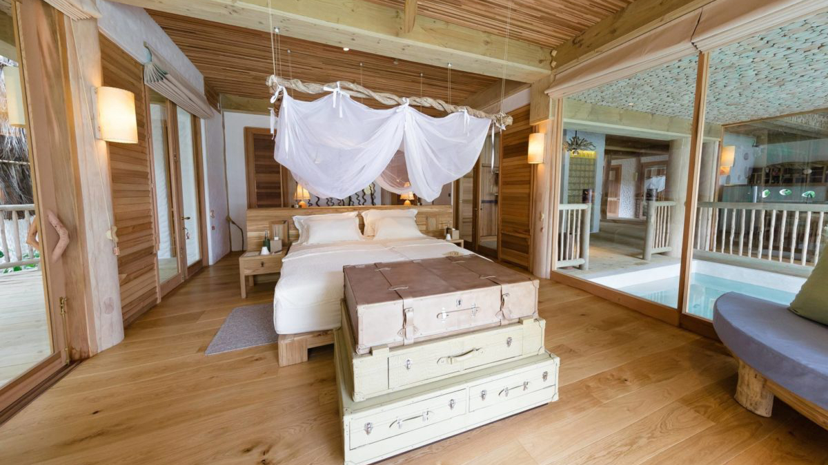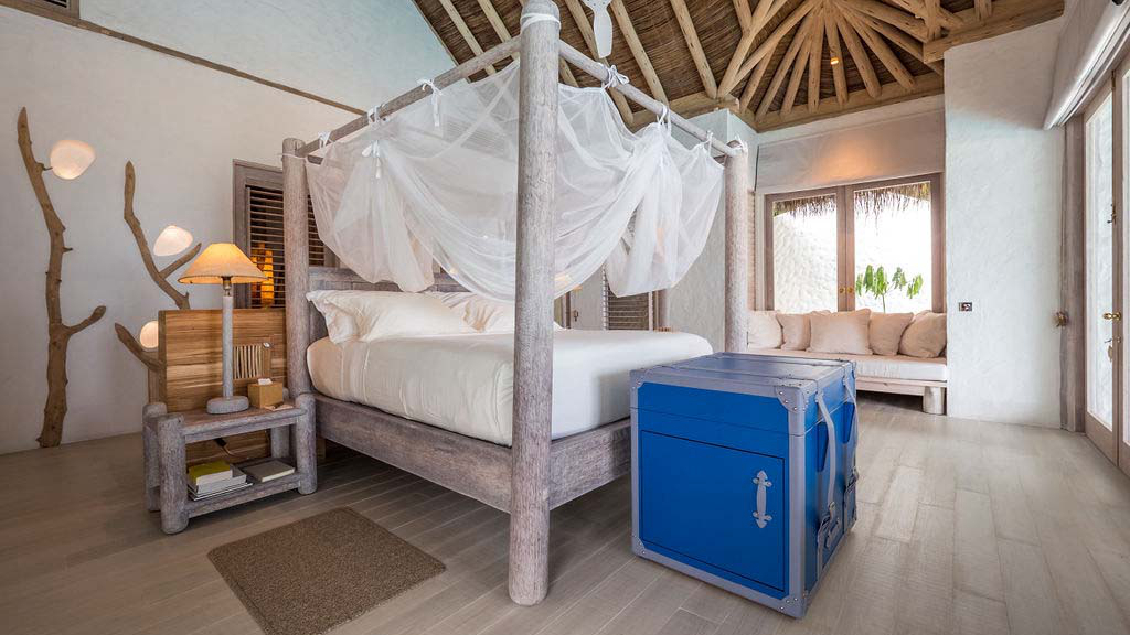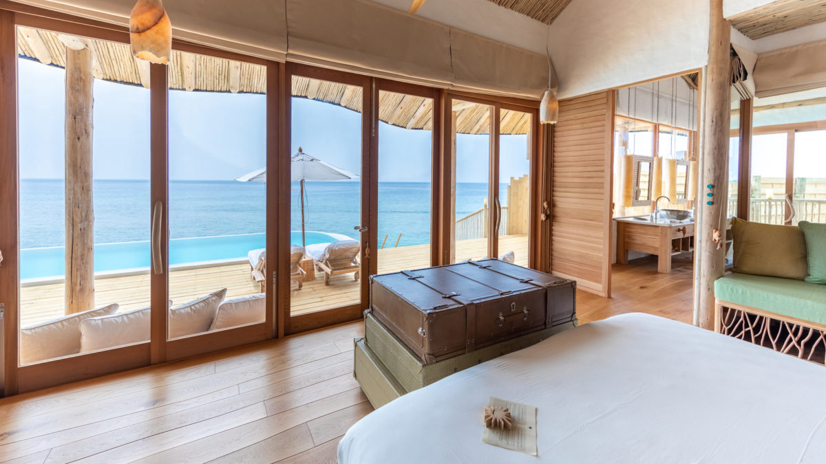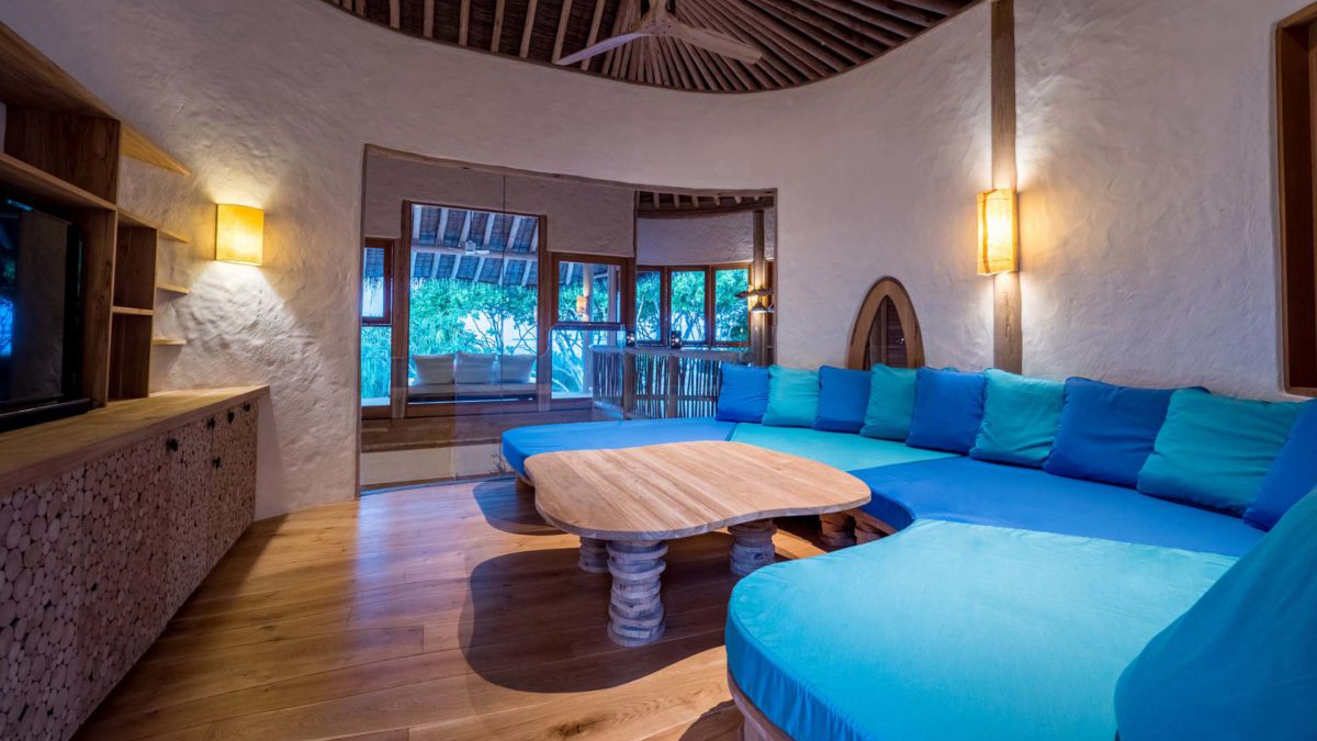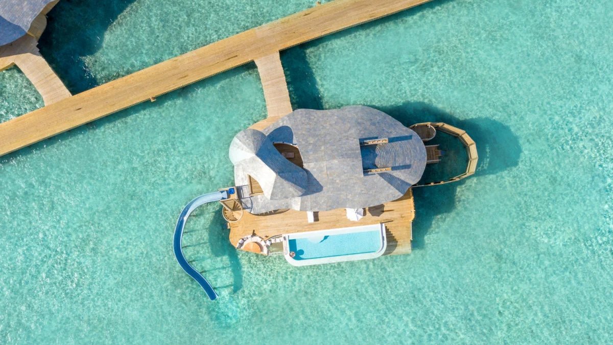从主岛通过一个弯曲的码头进入,单卧室带滑梯的水上别墅直接坐落在印度洋清澈的水面上。这座宽敞的别墅以大海为灵感,采用别致、低调的装饰,拥有宽敞明亮的居住区,附近还有食品储藏室和迷你酒吧。