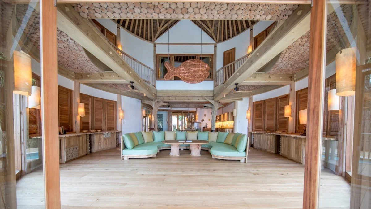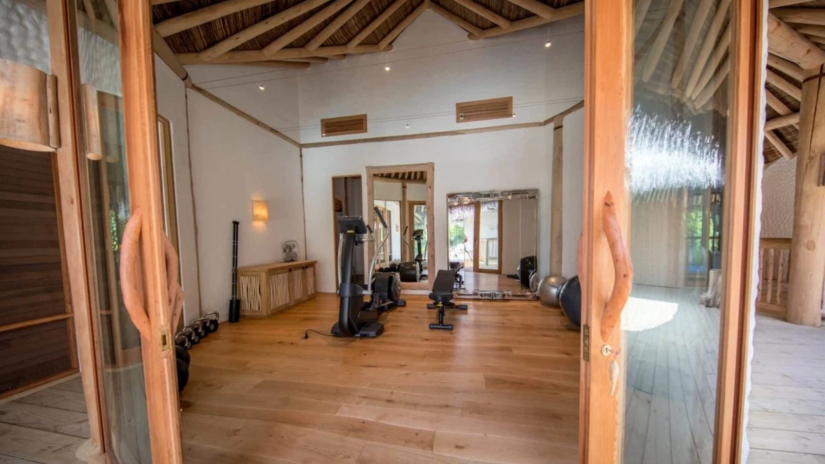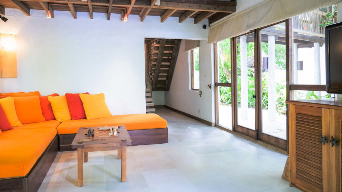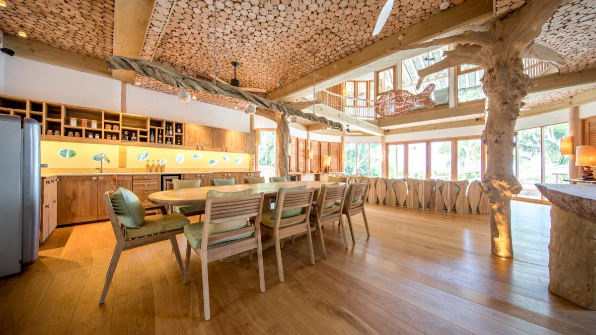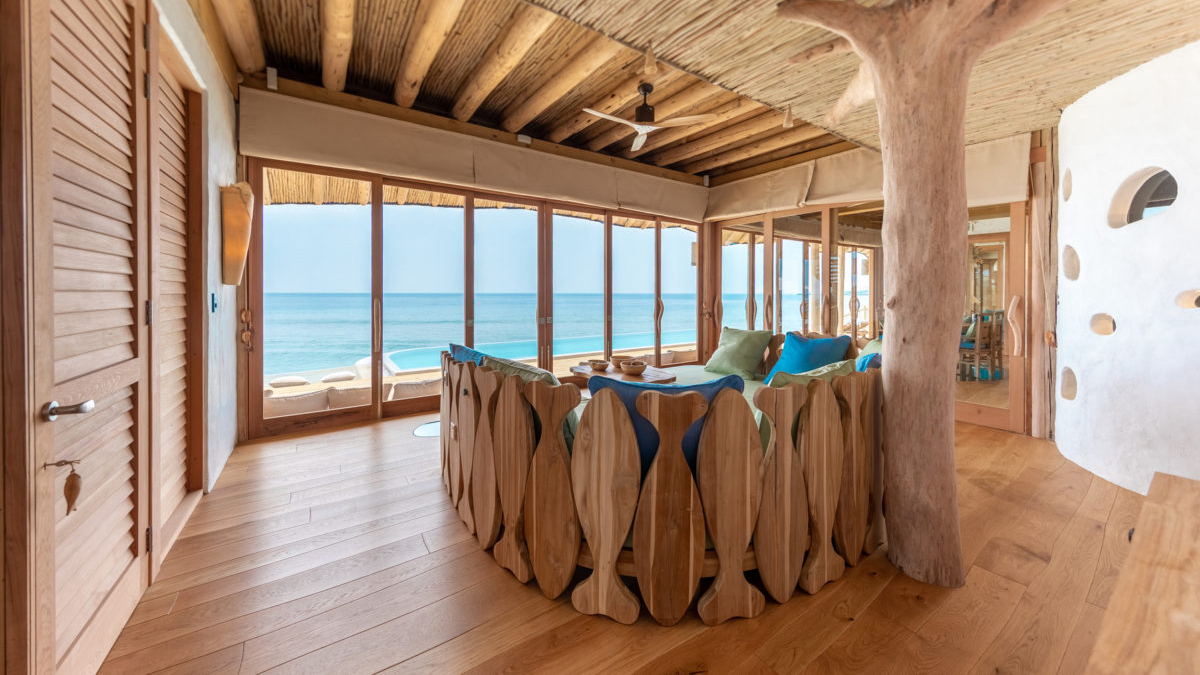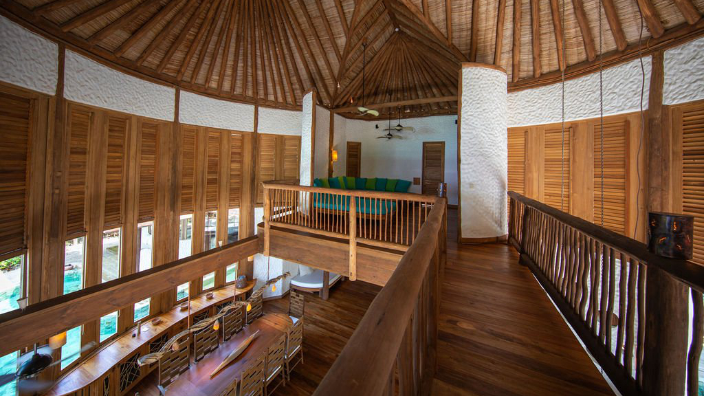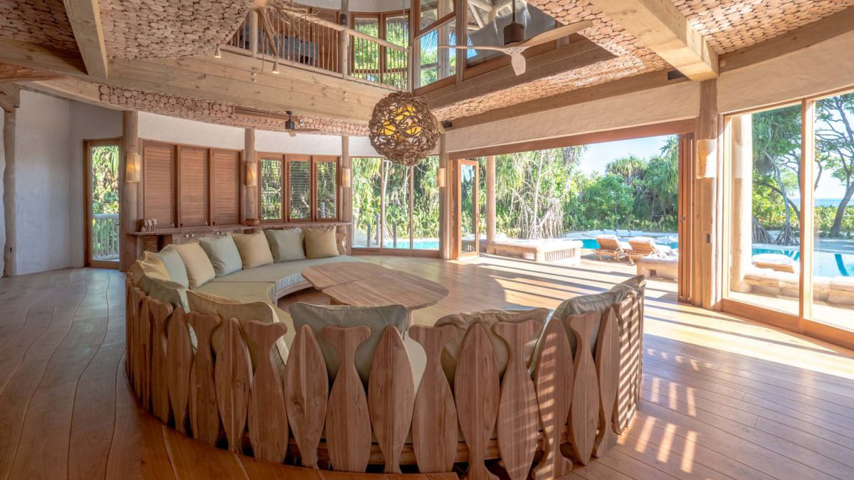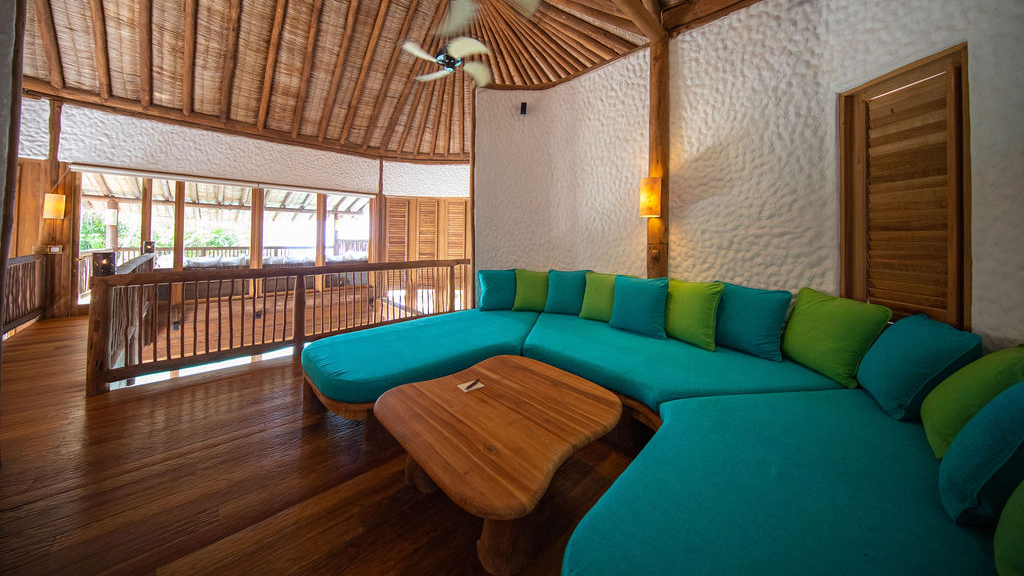 这座宽敞的别墅拥有两间一楼卧室,室外卫生间绿意盎然,配有一个大浴缸和露天淋浴。开放式客厅、餐厅、厨房和食品储藏室位于一楼的大卧室之间,由宽敞的木质地板连接。一楼还有一个带桑拿和蒸汽房的水疗套房。在楼上,穿过螺旋楼梯可以到达另外两间带独立卫生间和私人阳台的客房。还有一个私人健身房,有自己的浴室和淋浴,楼上还有一张可以眺望印度洋的日托床。