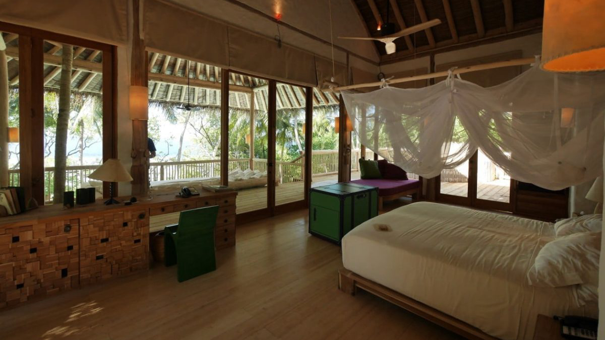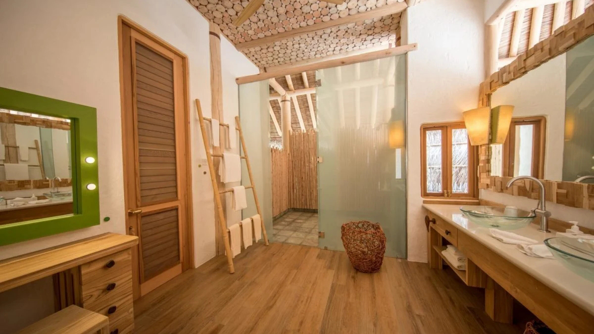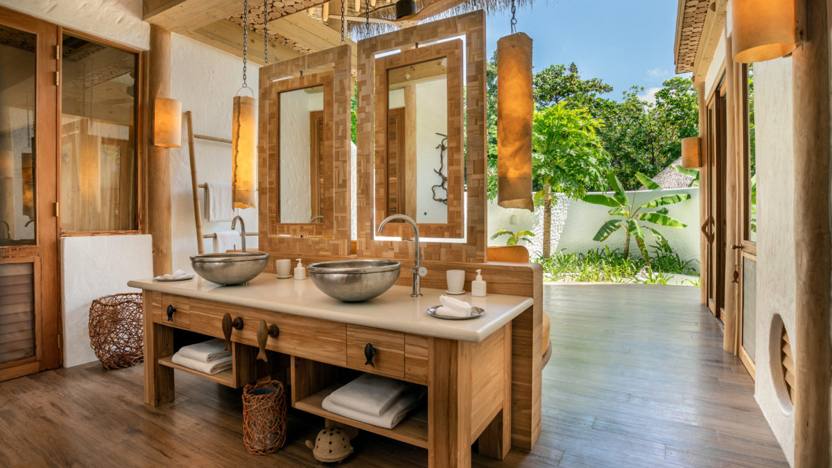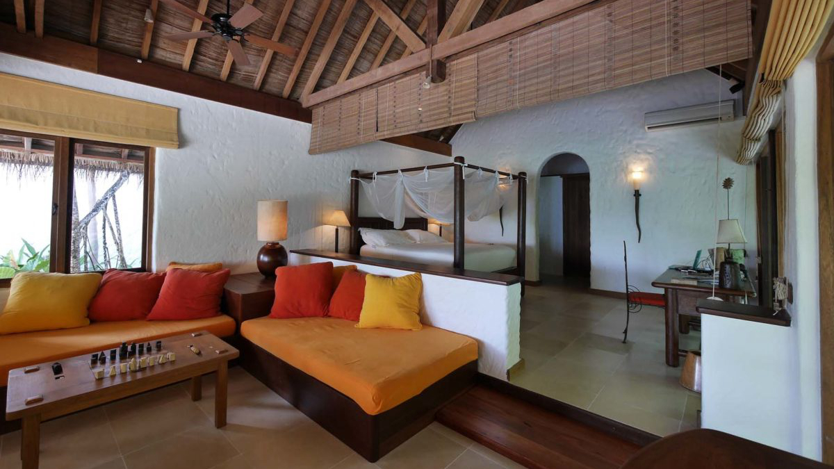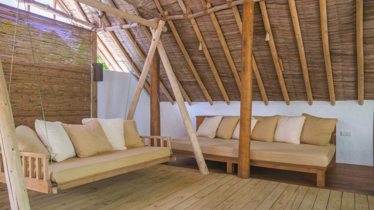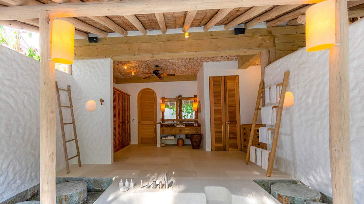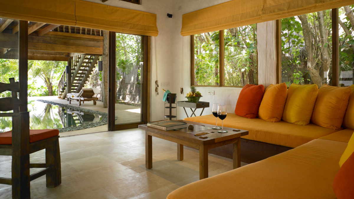 这座宽敞的别墅拥有两间一楼卧室,室外卫生间绿意盎然,配有一个大浴缸和露天淋浴。开放式客厅、餐厅、厨房和食品储藏室位于一楼的大卧室之间,由宽敞的木质地板连接。一楼还有一个带桑拿和蒸汽房的水疗套房。在楼上,穿过螺旋楼梯可以到达另外两间带独立卫生间和私人阳台的客房。还有一个私人健身房,有自己的浴室和淋浴,楼上还有一张可以眺望印度洋的日托床。