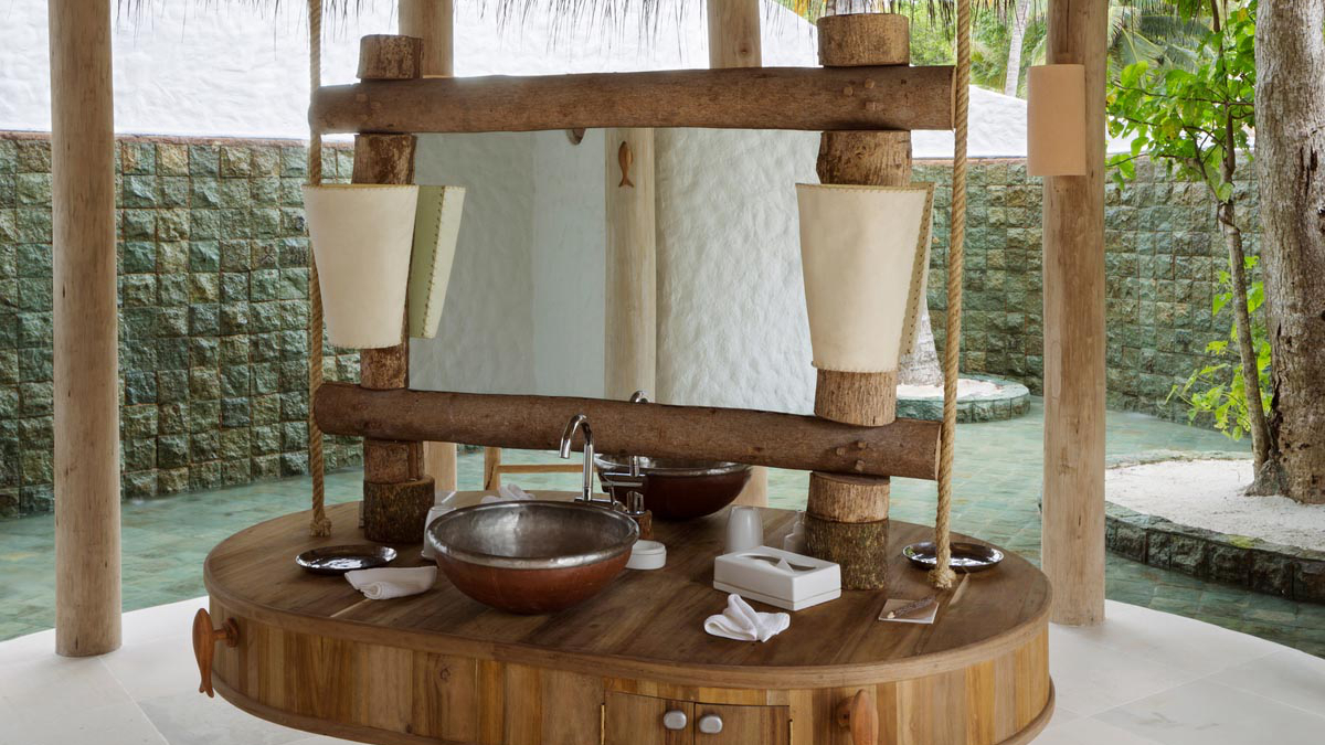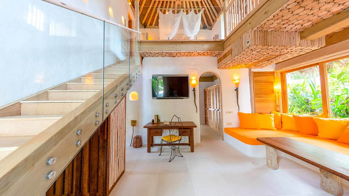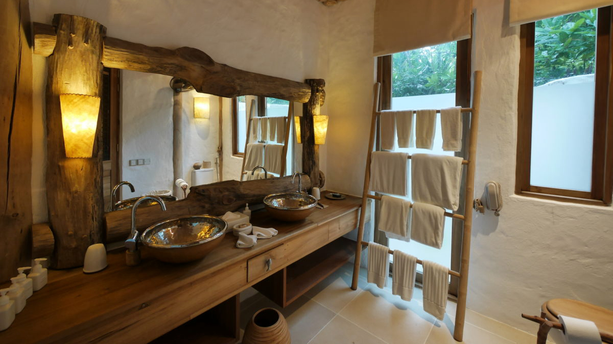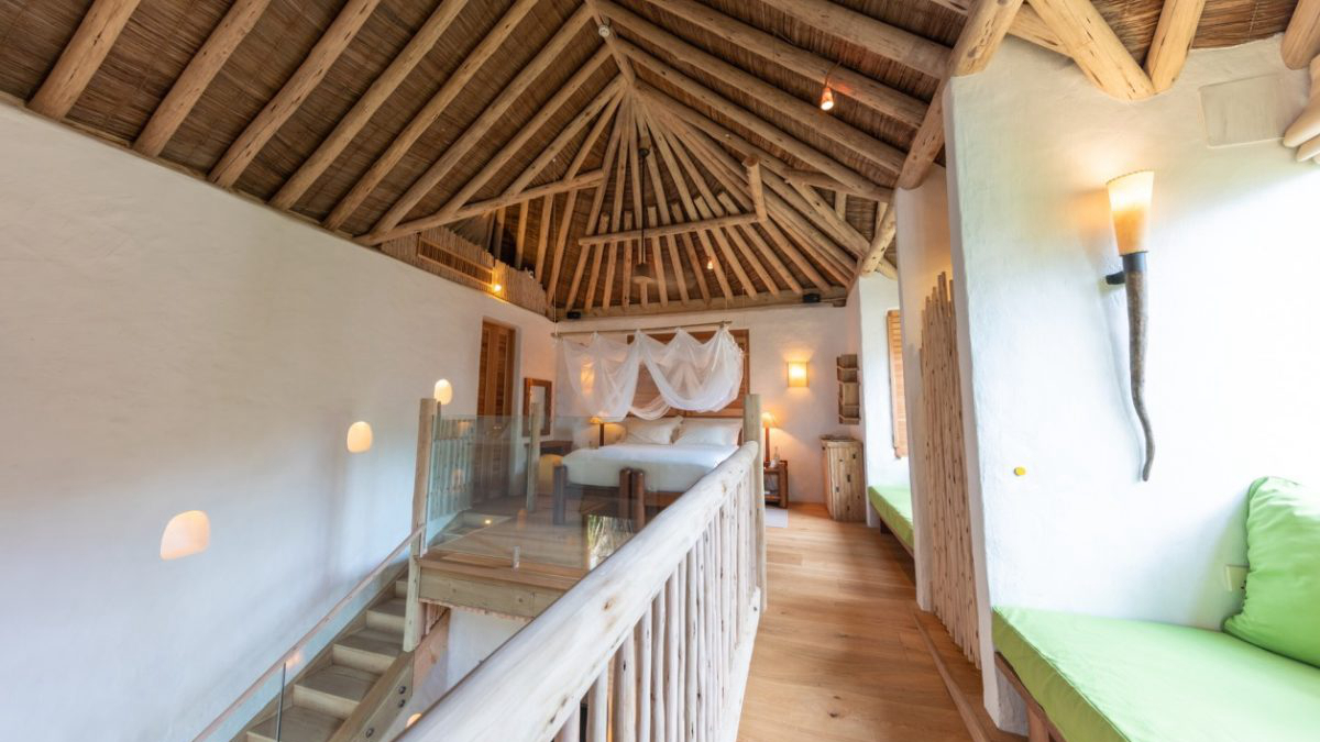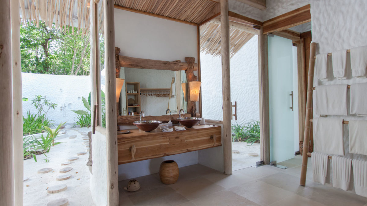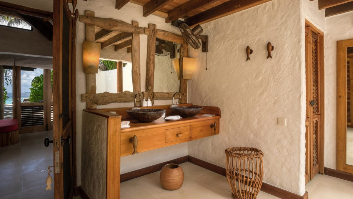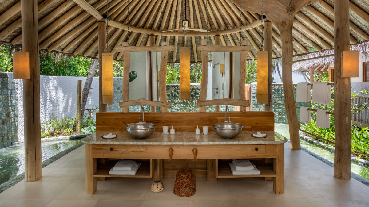 这座宽敞的别墅拥有两间一楼卧室,室外卫生间绿意盎然,配有一个大浴缸和露天淋浴。开放式客厅、餐厅、厨房和食品储藏室位于一楼的大卧室之间,由宽敞的木质地板连接。一楼还有一个带桑拿和蒸汽房的水疗套房。在楼上,穿过螺旋楼梯可以到达另外两间带独立卫生间和私人阳台的客房。还有一个私人健身房,有自己的浴室和淋浴,楼上还有一张可以眺望印度洋的日托床。