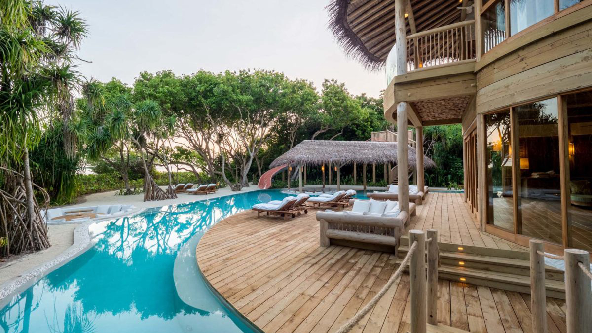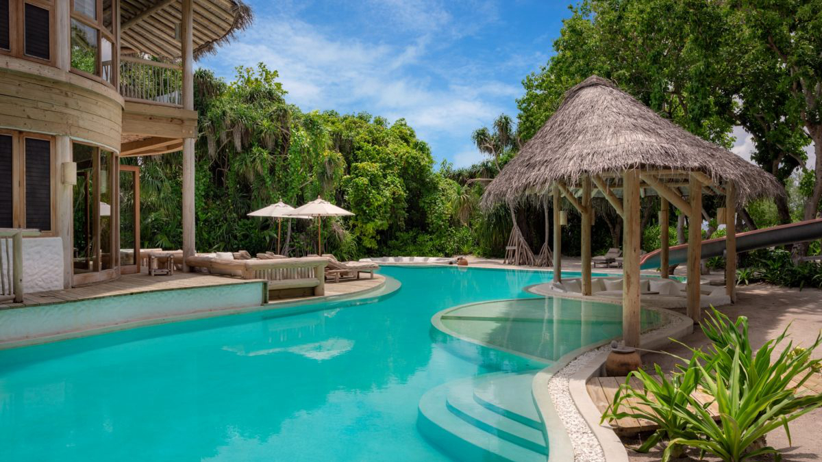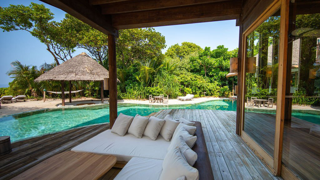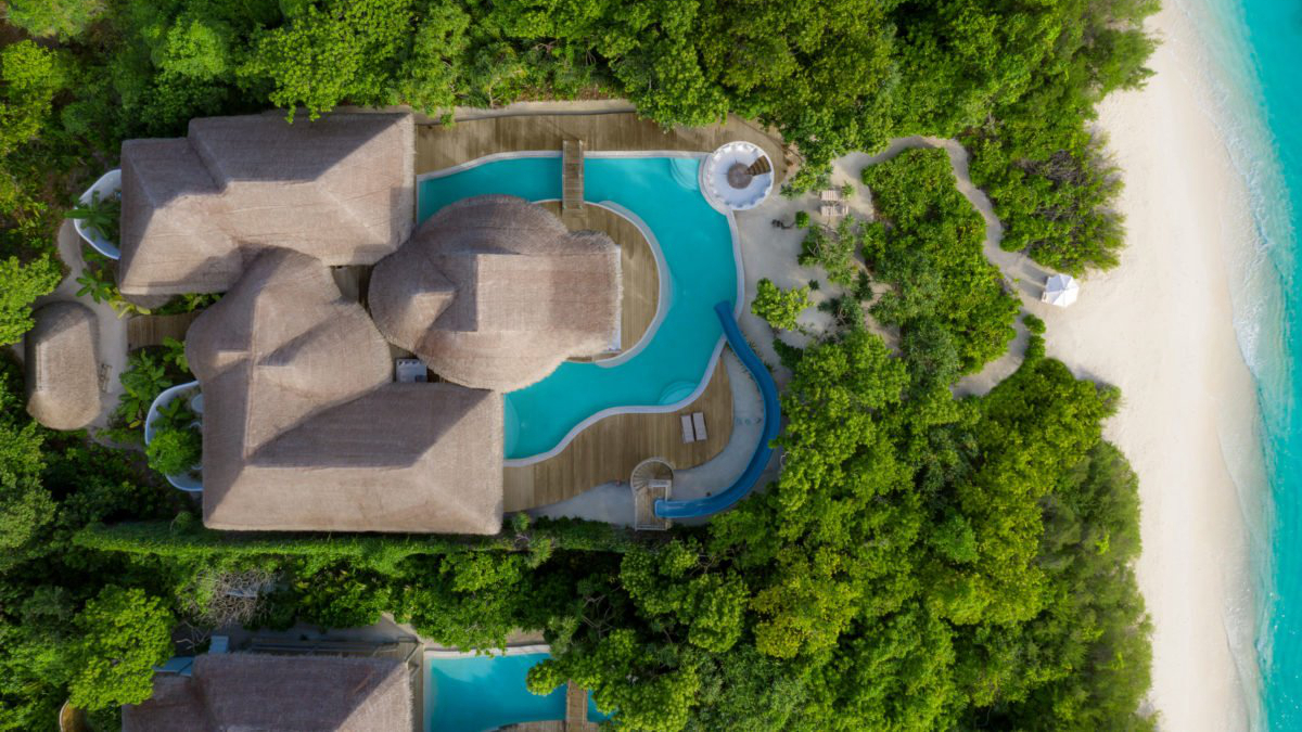 三卧室沙滩泳池别墅横跨两栋复式别墅。两个室外浴室让你在星空下沐浴,绝对隐私。无论是在光线充足的室内、顶层甲板还是大型私人游泳池旁,都有足够的空间用餐和躺卧。还有一个书房和一个专门的儿童游泳池。
