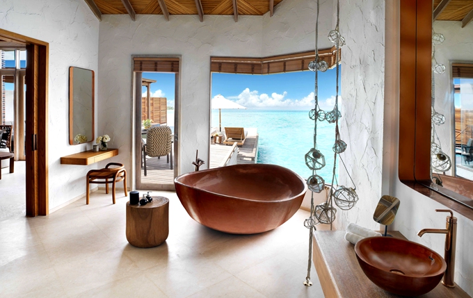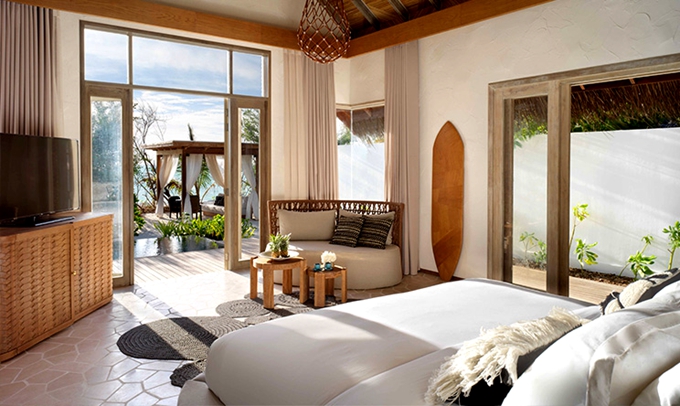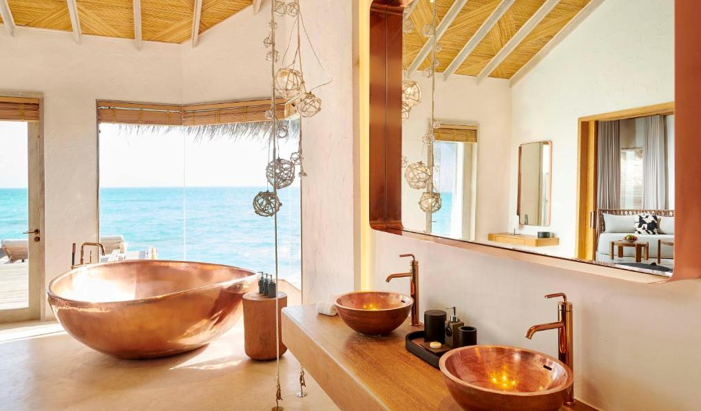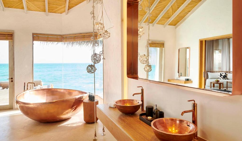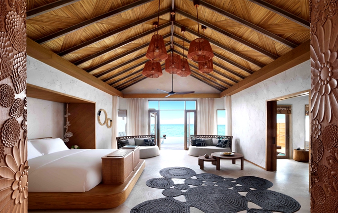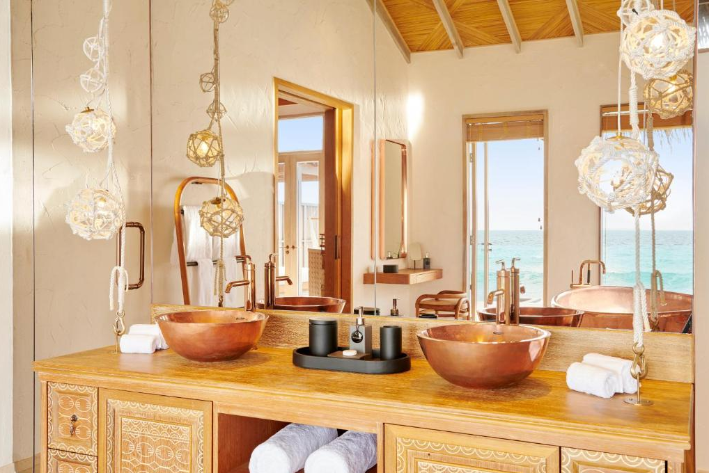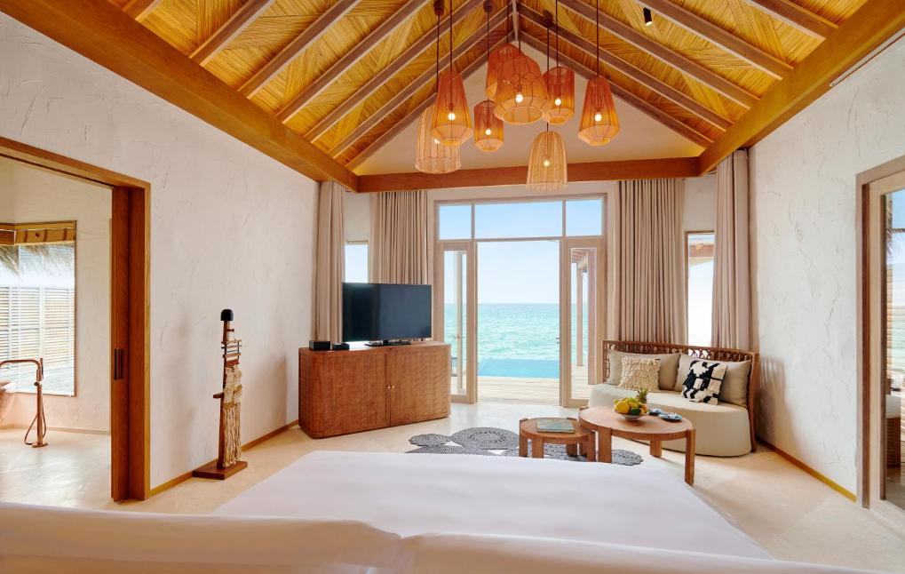 三卧室日落水上别墅是您和家人的隐世之所,采用优雅的乡村风格设计,是一套马尔代夫风格的住所,躺在超大的浴缸中听着潺潺的水声放松,设有私人甲板,私人大厅,73平方米的泳池,浴室设有独立淋浴间,双水槽,Nespresso咖啡机,酒柜,Bose音响系统,加州特大号床,夜晚户外可以欣赏无尽的蓝色和繁星。如果你有什么需要就叫你私人管家,每天24小时待命或骑着自行车巡游度假村。