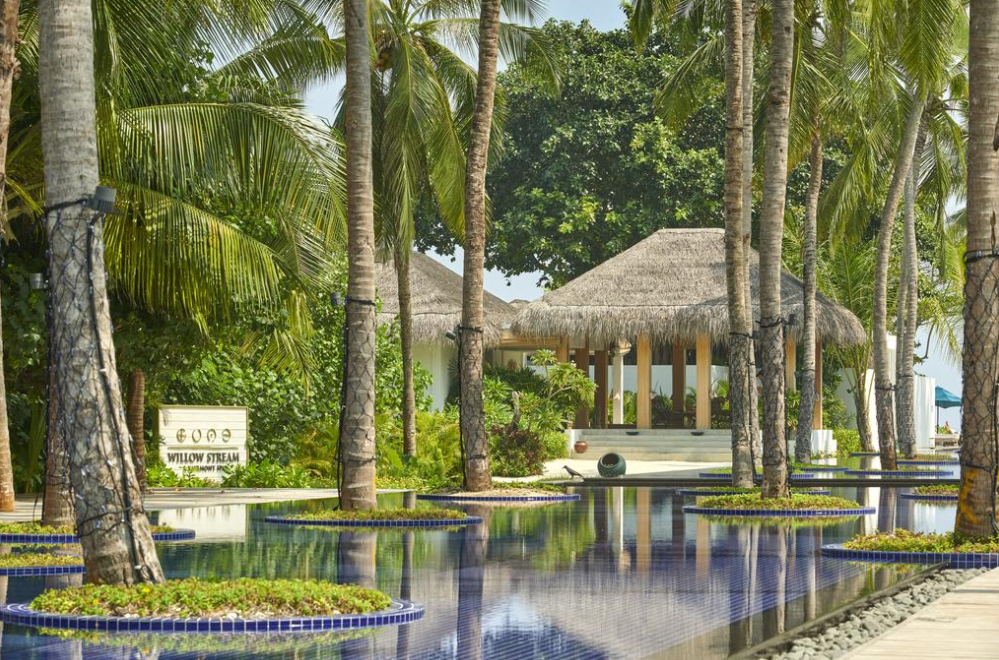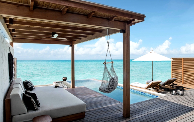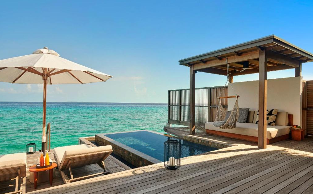 日出水上别墅采用优雅的乡村风格设计,是一座探索马尔代夫风格的住所,听着潺潺的水声放松,日出水上别墅配有一个超大型的浴缸,私人大厅、19平米的泳池,浴室设有独立淋浴间,双水槽,Nespresso咖啡机,酒柜,Bose音响系统,加州特大号床,夜晚户外可以欣赏无尽的蓝色和繁星。如果你有什么需要可以打电话给你的私人管家,24小时全天候待命,也可以骑着自行车巡游度假村