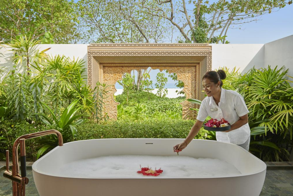日出豪华海滩别墅建在完美的白色沙滩边,设有独立的浴室,有独立的淋浴间,双水槽,Nespresso咖啡机,酒柜、Bang & Olufsen音响系统、加州特大号床和一个独立的起居室,可享受户外的私人浴室,浴缸和淋浴,一个25平方米的游泳池,一个放松和吃饭的大厅、如果你有什么需要可以打电话给你的私人管家,24小时全天候待命,也可以骑着自行车巡游度假村。