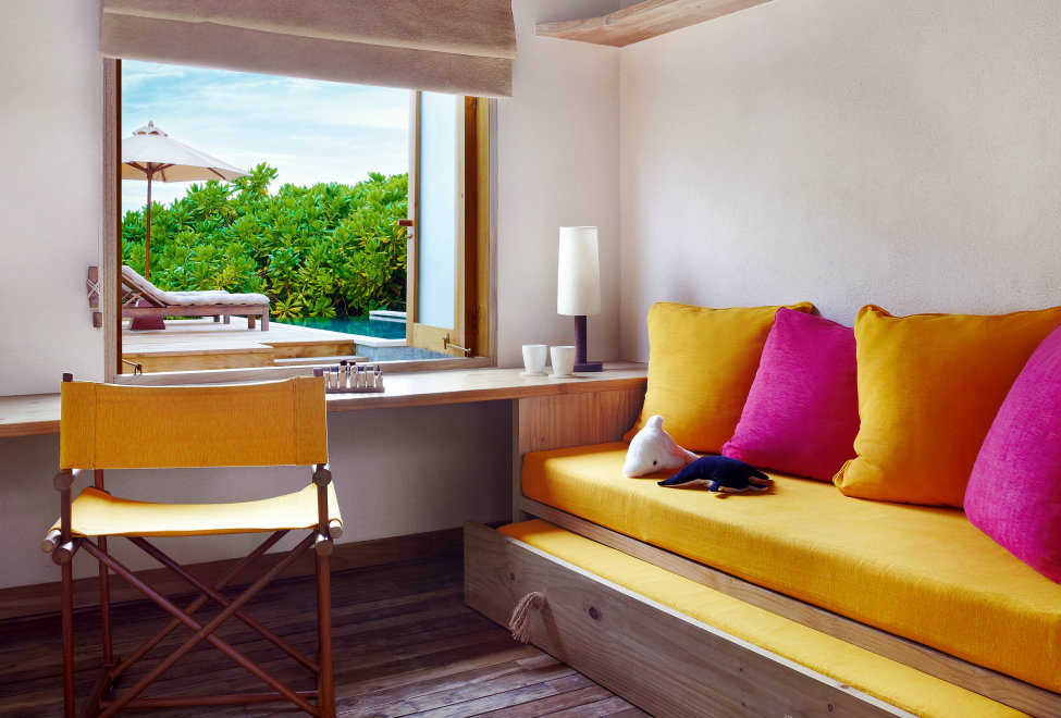 房型介绍:修建于印度洋泄湖之上,内嵌式海洋观景全玻璃浴缸;私人泳池,私人水上花园;户外休闲平台,带休闲椅、日光室和水上护网;水族馆甲板进餐区,全玻璃桌面;全景礁湖水滑道;儿童卧室。这一侧日落,日落侧的价格比Laamu Water Villa with Pool价格要高。