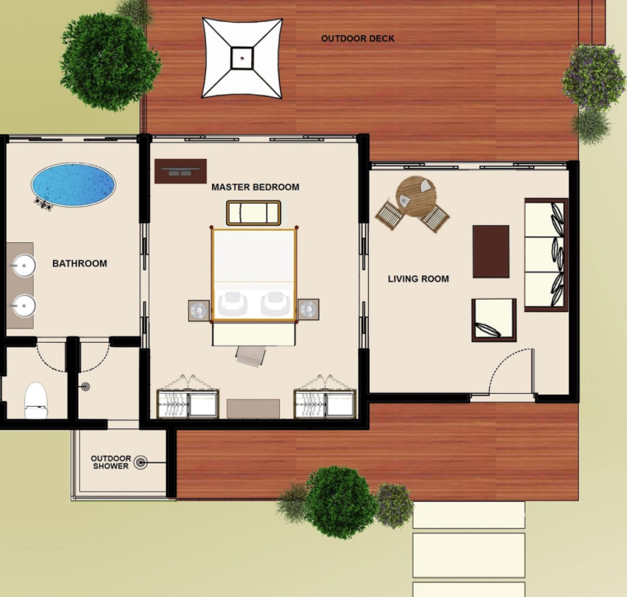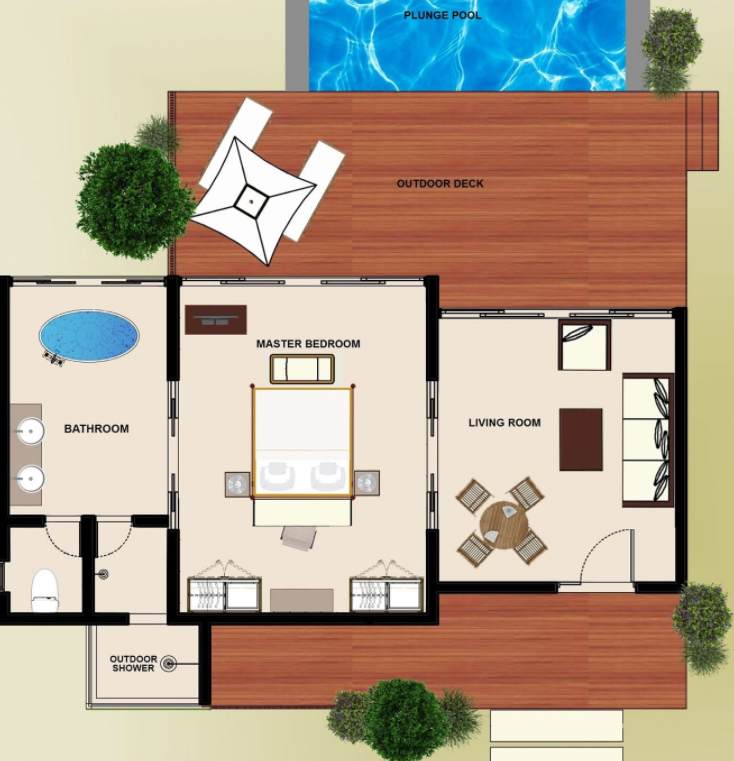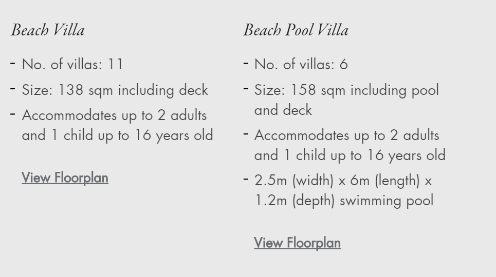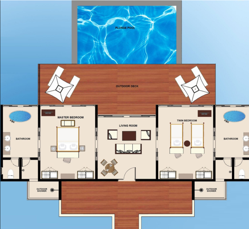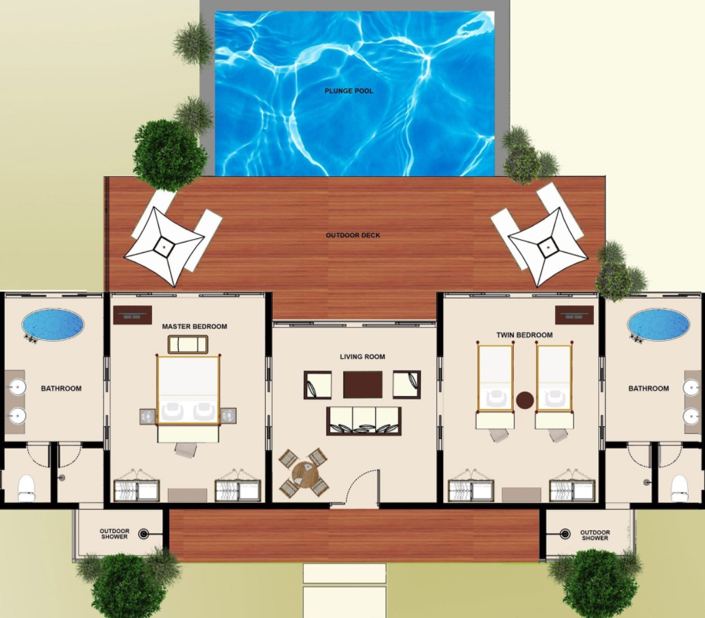 瑞喜敦岛上唯一的2间双卧泳池沙滩别墅,面积为273平米,是家庭旅游客人的理想之选。看房型就知道,此房间最多可以提供5个成人同时居住,您和您的朋友们或者家人们一起嬉戏在沙滩上,或者一起在泳池中放松身心。次卧设了两张单人床或者一张特大号床,你可以随心所以的安排入住的卧室,并且房间还提供一对一的管家服务,非常舒心。