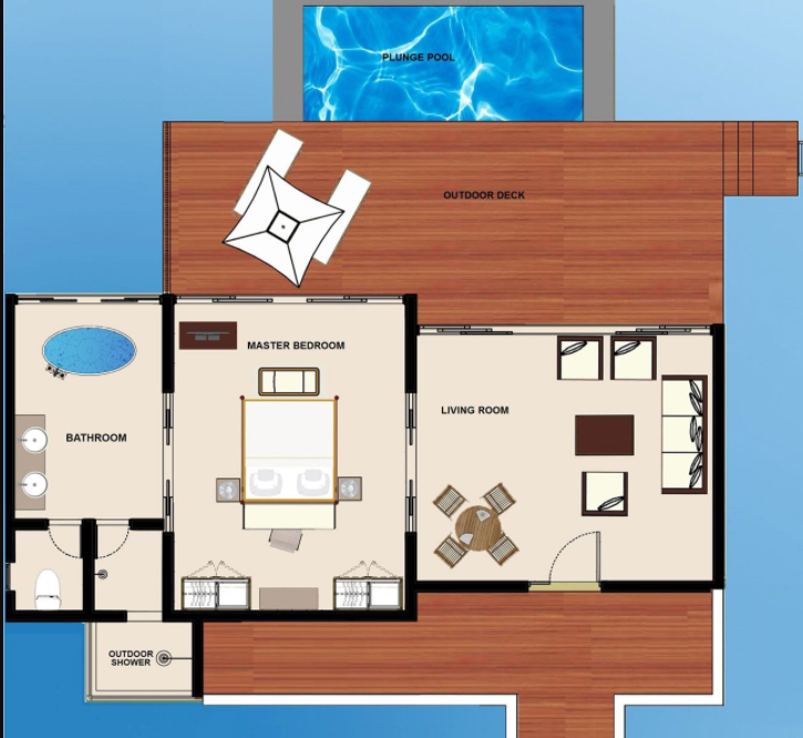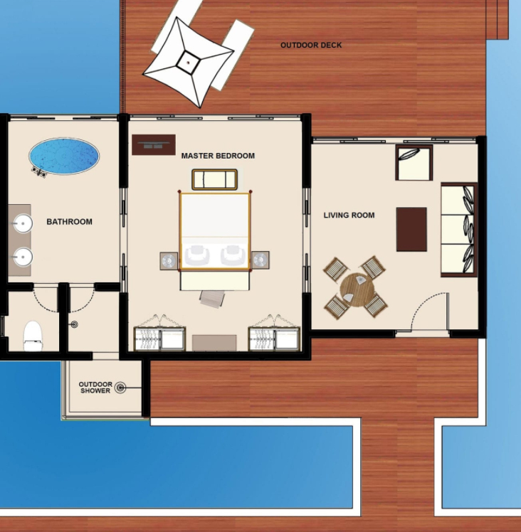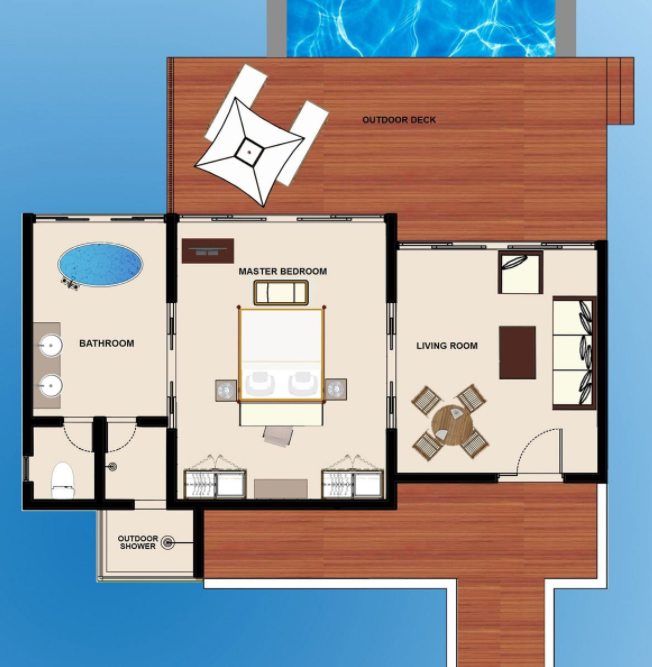 房型介绍:豪华水上泳池别墅设有一个供客人享受豪华空间的客厅。客人可享受轻松自在的阅读时光,亦或在宽敞的空间里自由玩耍,享受最佳的舒适度。
