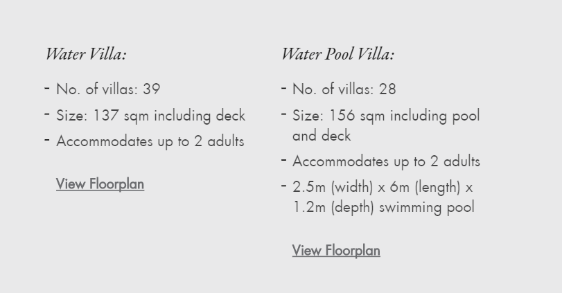 | 水双卧泳池水上别墅--Two Bedroom Water Pool Villa | 4 | 282平 | √ | 5大/4大2小 |