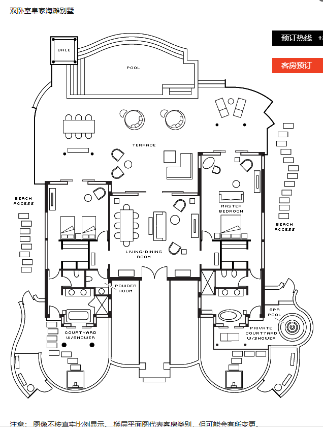 | 沙 豪华带泳池的海滩庭院别墅--Deluxe Beach Pavillion with Pool | / | 55平 | √ | 2大 / 2大2小 |