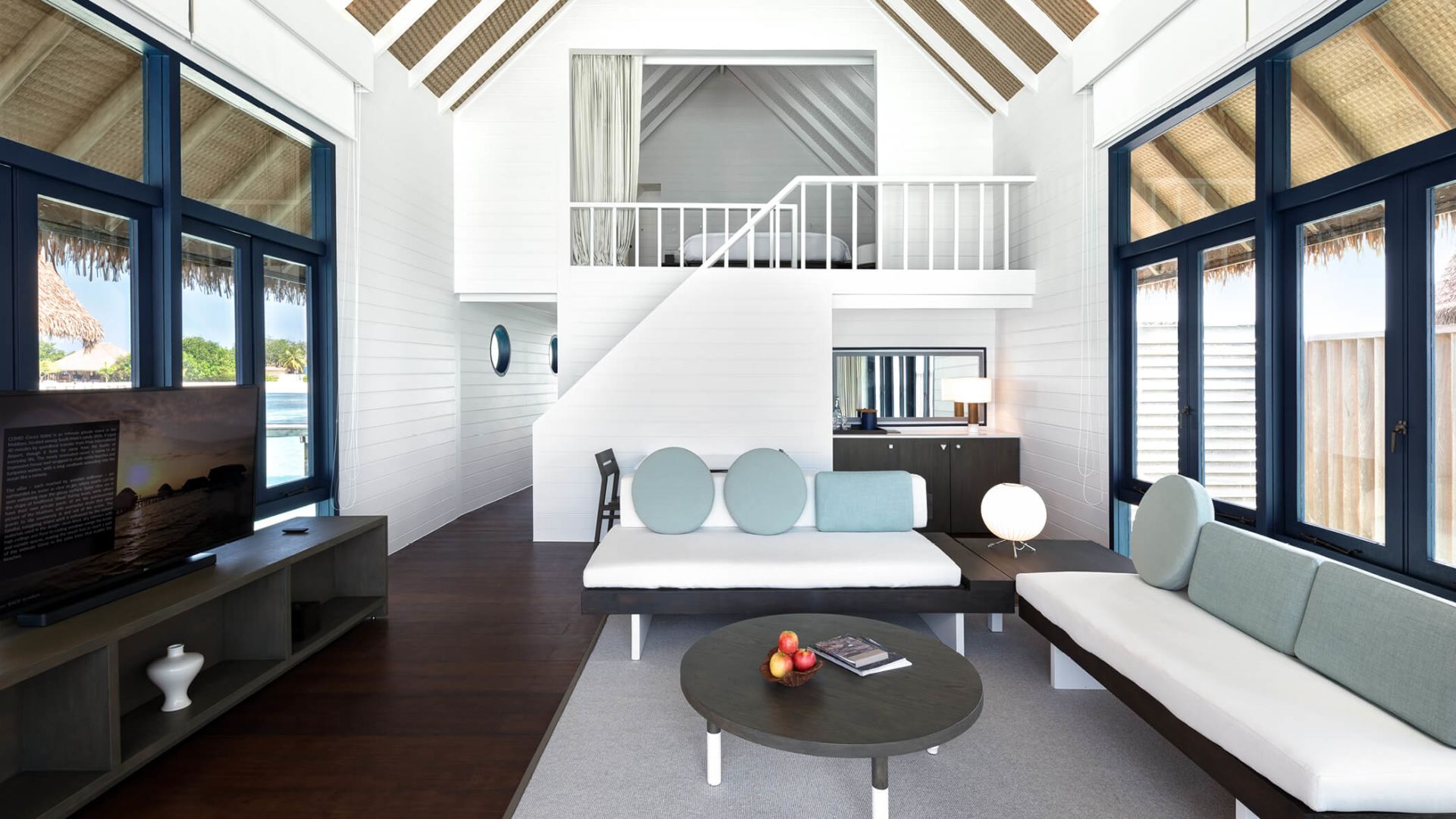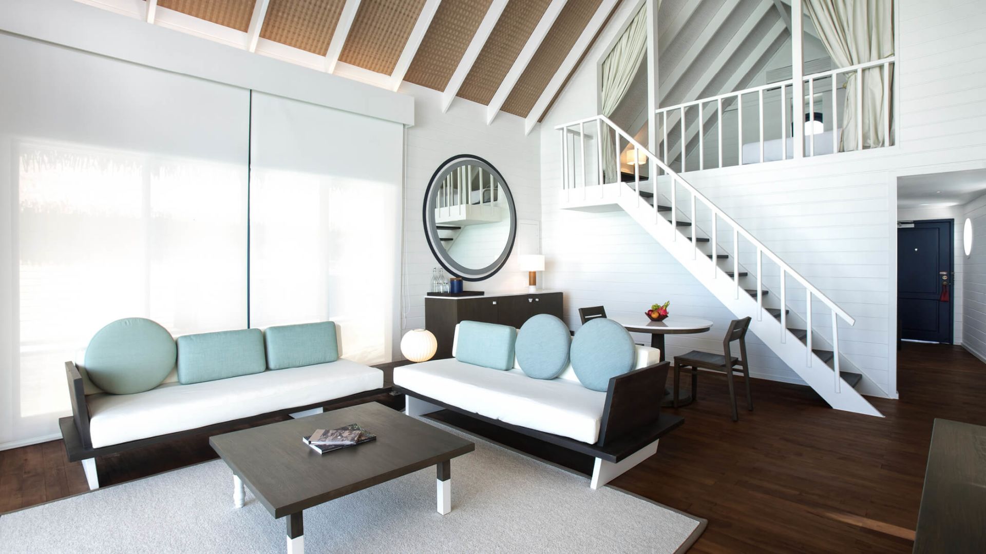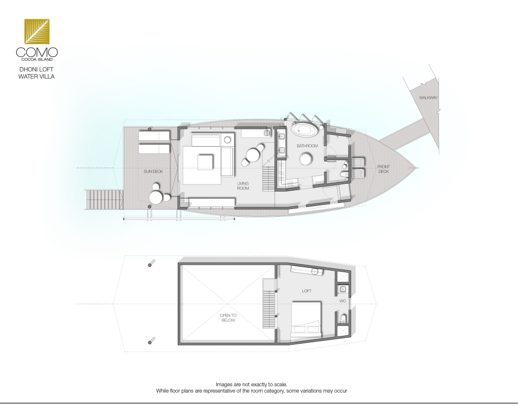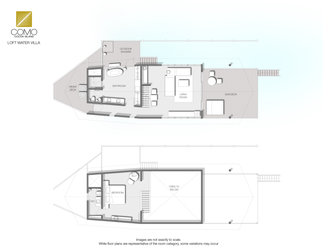 房型介绍:宽敞的起居区带有拱形天花板,三面均为落地玻璃窗。有一道楼梯通向阁楼,阁楼内设一张特大床和独立卫生间。楼下有一个更大的卧室, 内设一个双人组合式梳妆盥洗盆、独立浴缸、淋浴隔间和卫生间。从日光甲板可直接下到礁湖。
