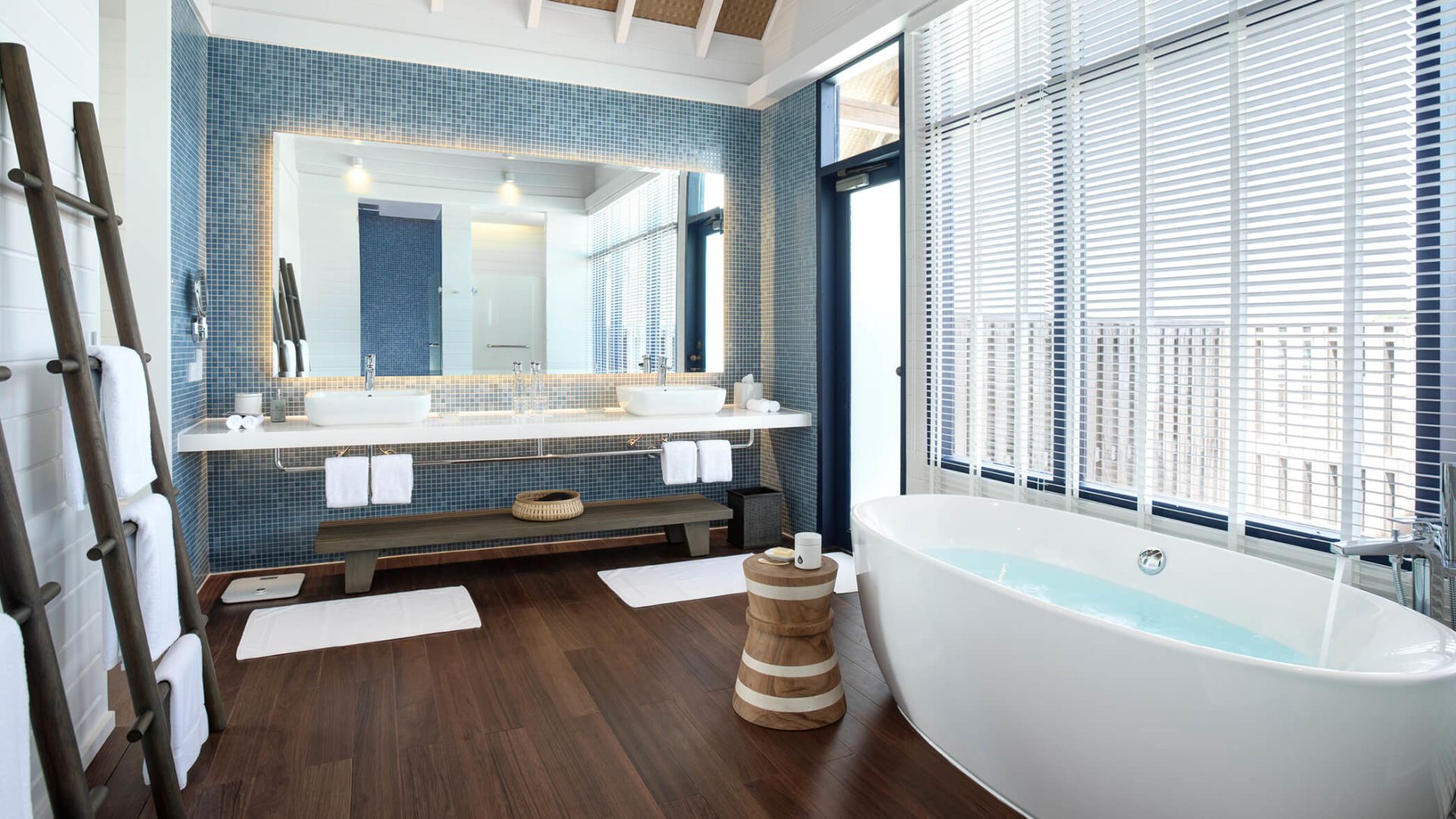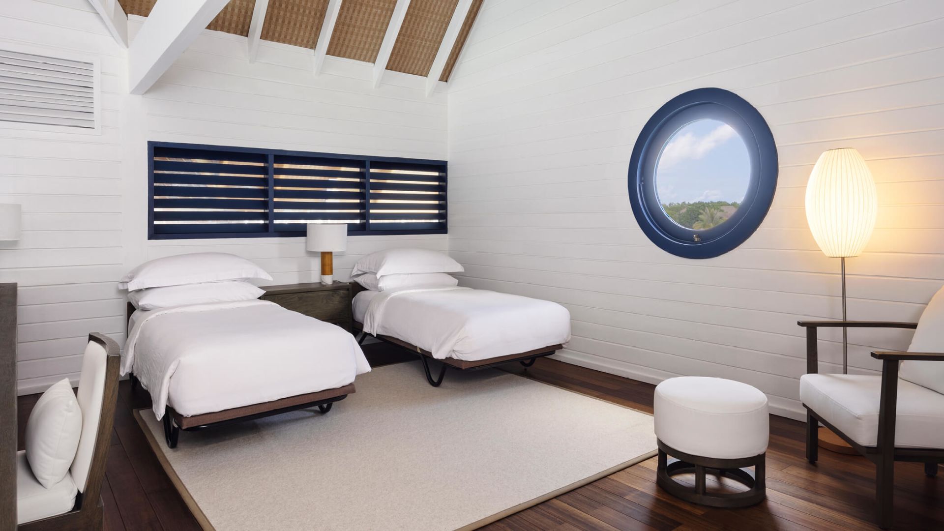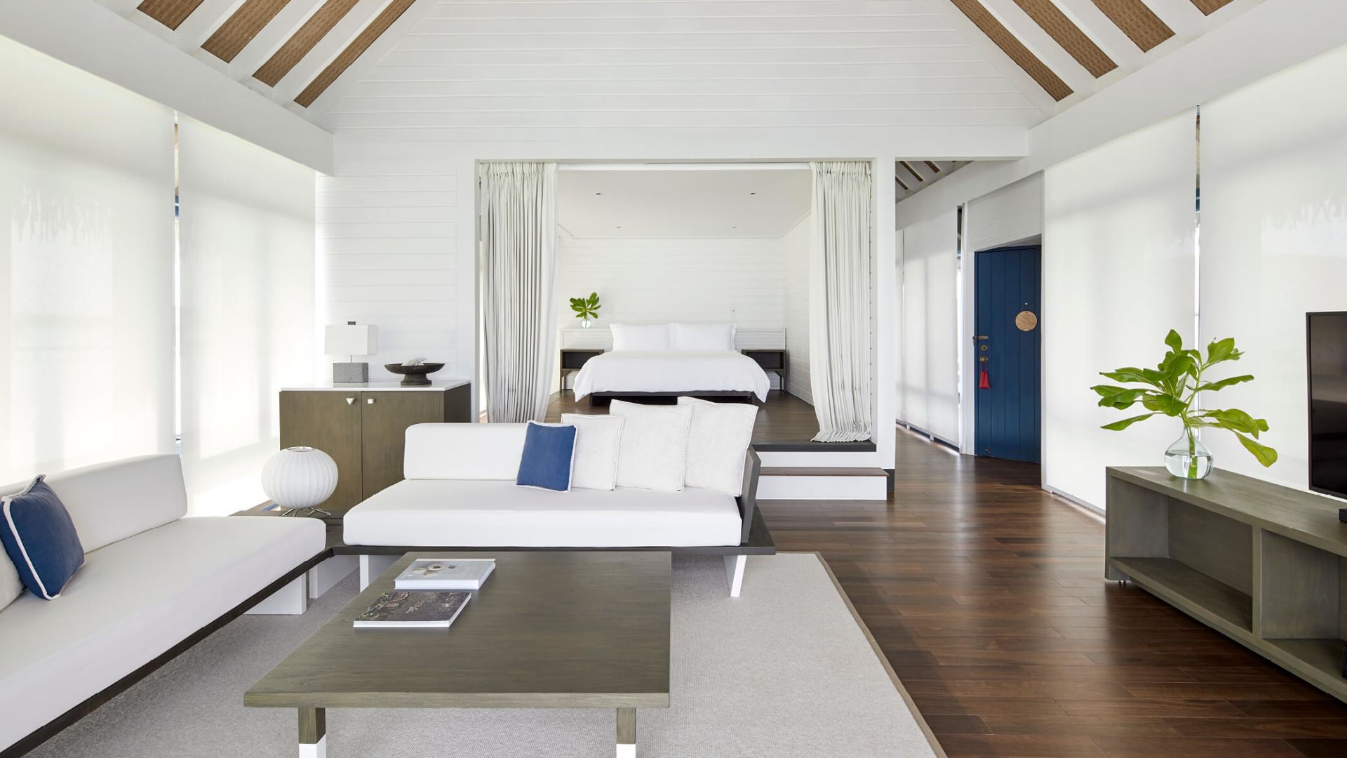 房型介绍:宽敞的起居区带有拱形天花板,三面均为落地玻璃窗。有一道楼梯通向阁楼,阁楼内设一张特大床和独立卫生间。楼下有一个更大的卧室, 内设一个双人组合式梳妆盥洗盆、独立浴缸、淋浴隔间和卫生间。从日光甲板可直接下到礁湖。