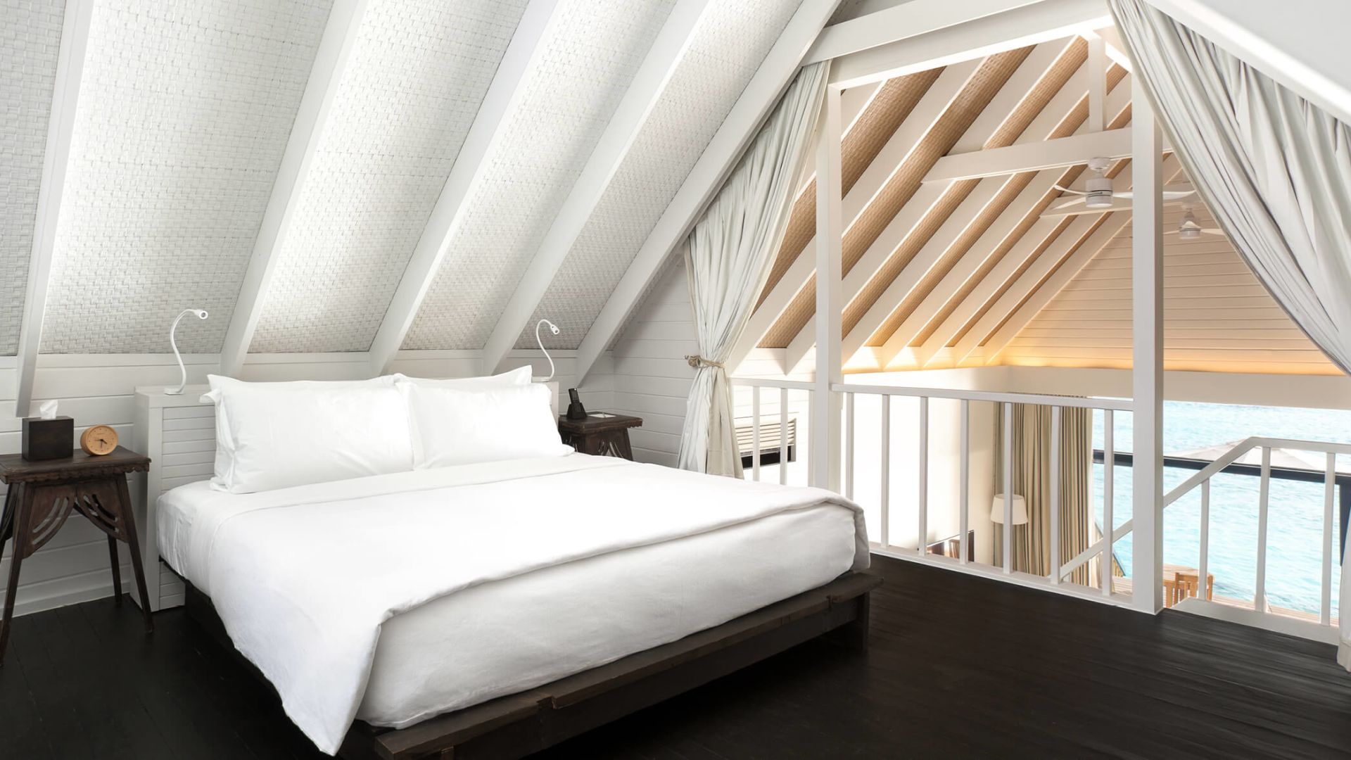 房型介绍:Loft Villa阁楼别墅提供宽敞的起居区,站在落地窗前可俯瞰印度洋。阁楼内有一张特大床和独立卫生间。主浴室包括:一个双人组合式梳妆盥洗盆、独立浴缸、卫生间, 以及一个隐蔽的户外淋浴处, 那里有台阶下到海里。Loft Villa 也有私人日光甲板。