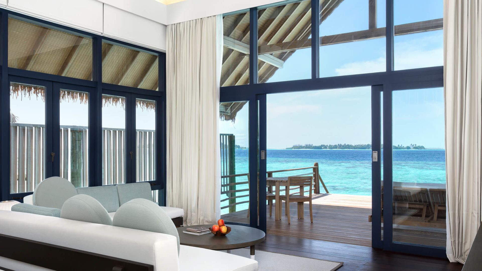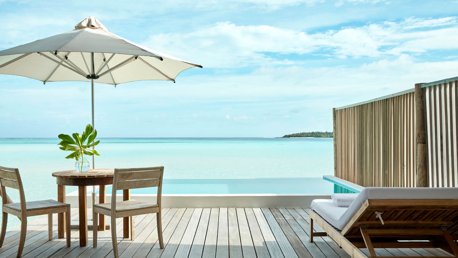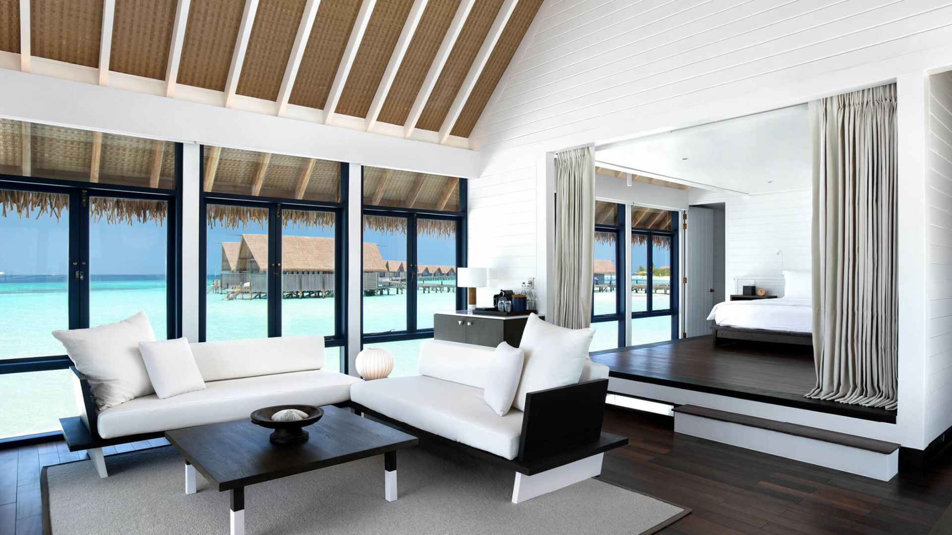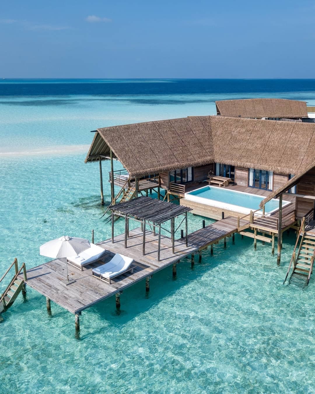 两卧室拥有独立的别墅,每个别墅都设有一间连接卧室和一个直接位于海洋上方的私人露台。共享的生活区和用餐区连接,两侧都有阳台,让您直接从甲板上步入绿松石泻湖。还有一个隐蔽的甲板,还有一个新的私人游泳池,几乎可以接触到海洋的边缘。它非常适合家人和朋友。