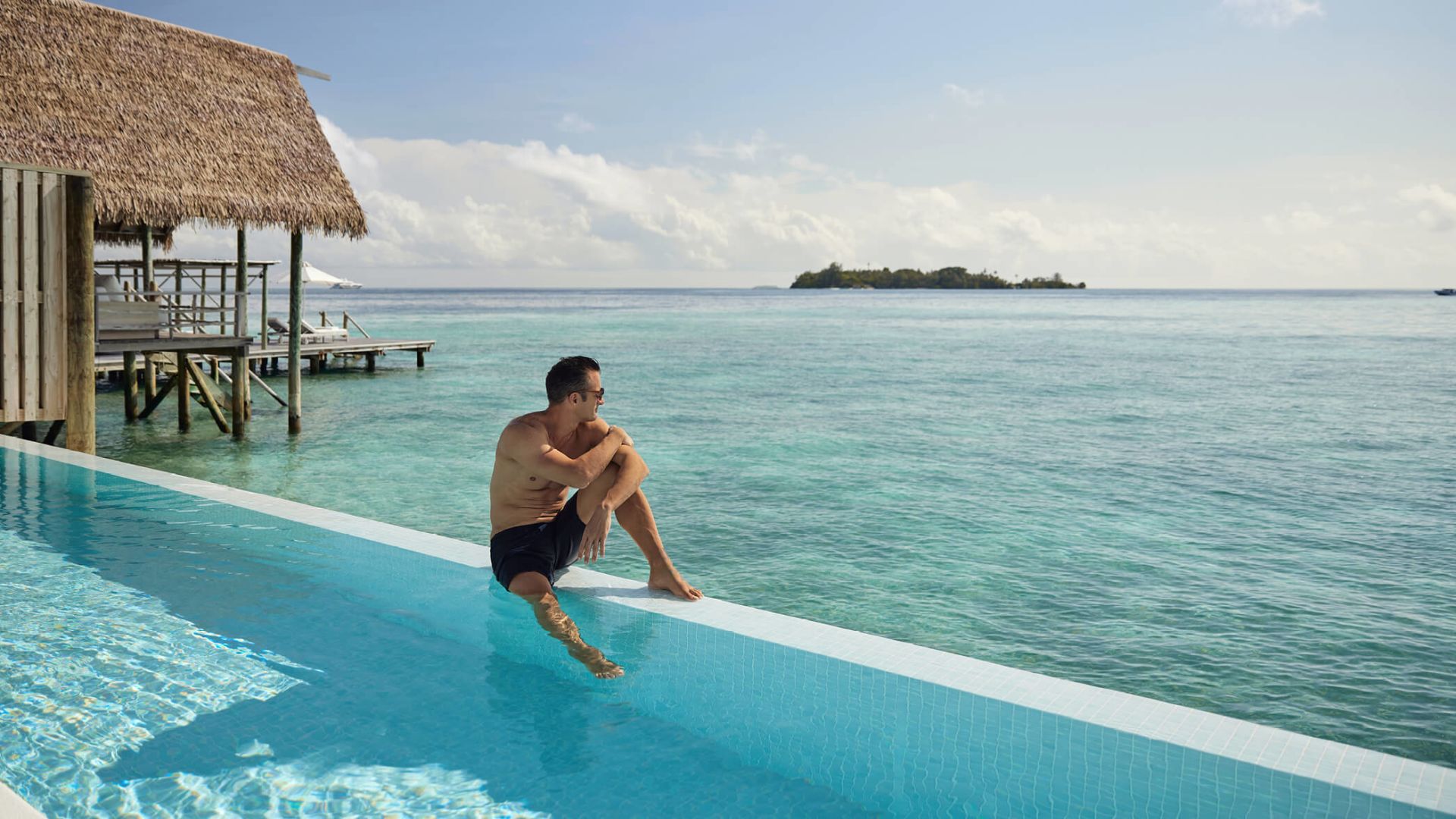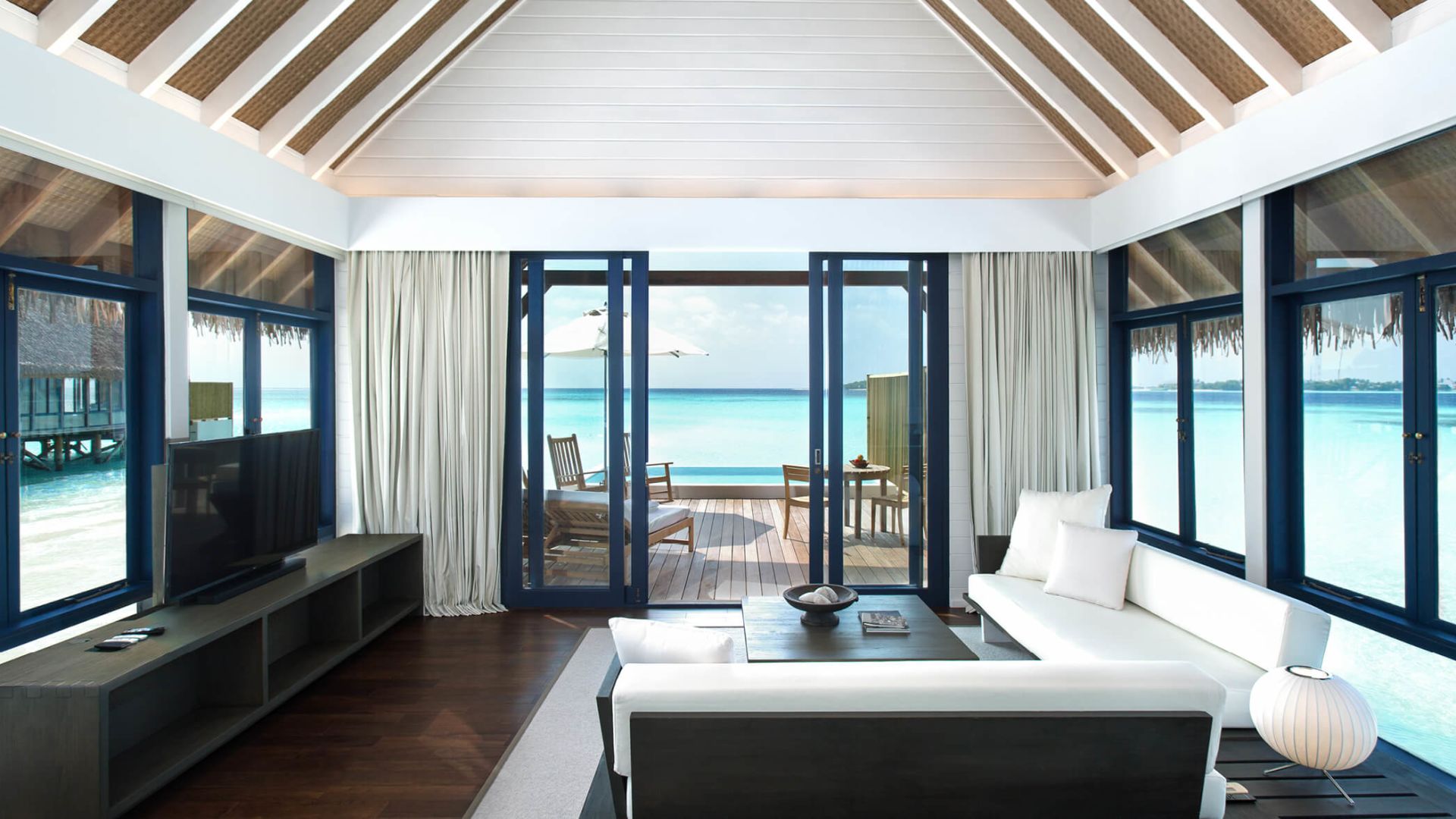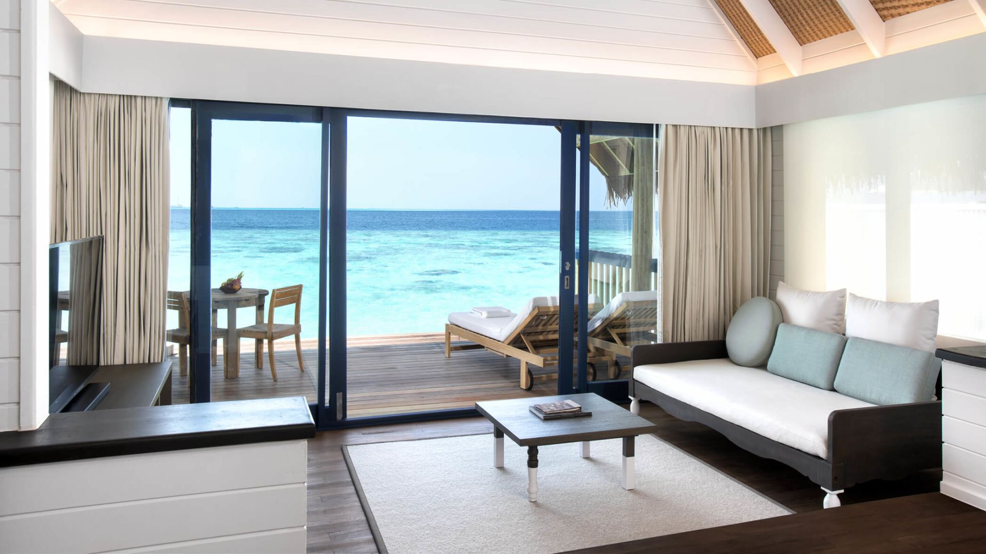 两卧室拥有独立的别墅,每个别墅都设有一间连接卧室和一个直接位于海洋上方的私人露台。共享的生活区和用餐区连接,两侧都有阳台,让您直接从甲板上步入绿松石泻湖。还有一个隐蔽的甲板,还有一个新的私人游泳池,几乎可以接触到海洋的边缘。它非常适合家人和朋友。