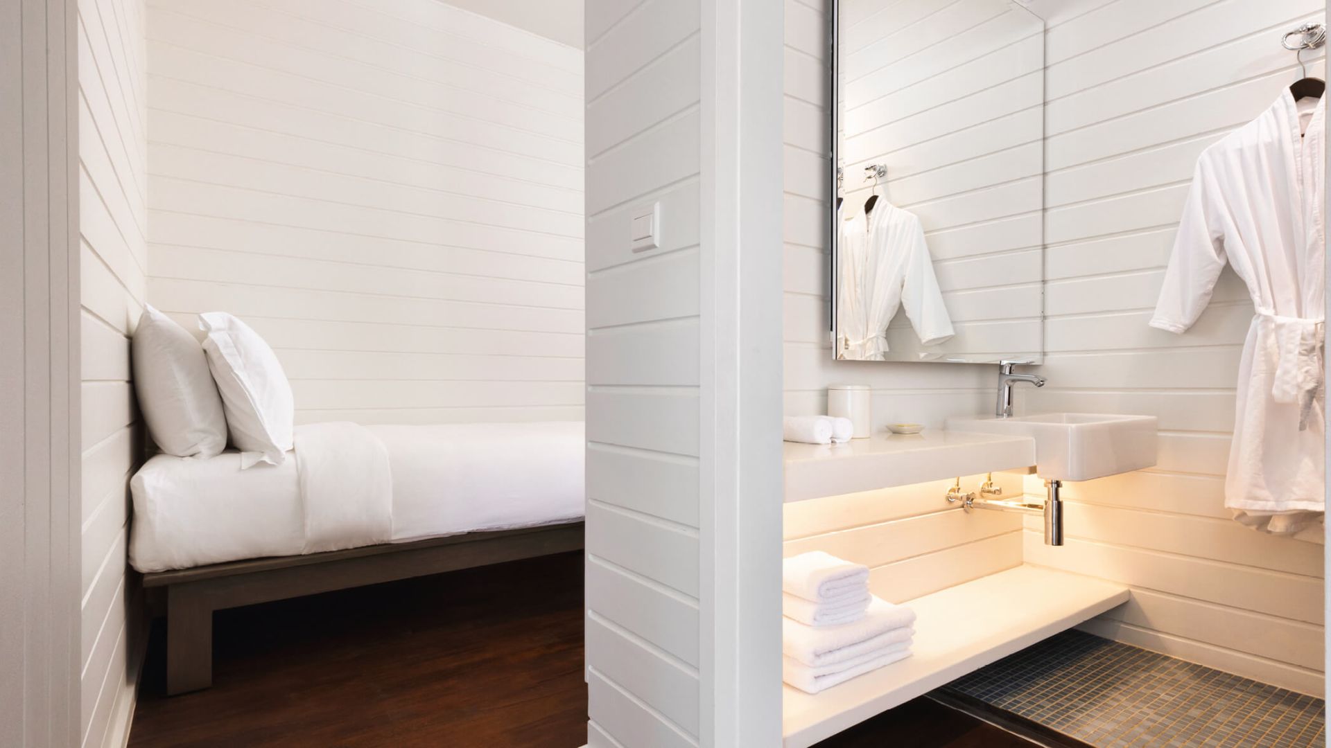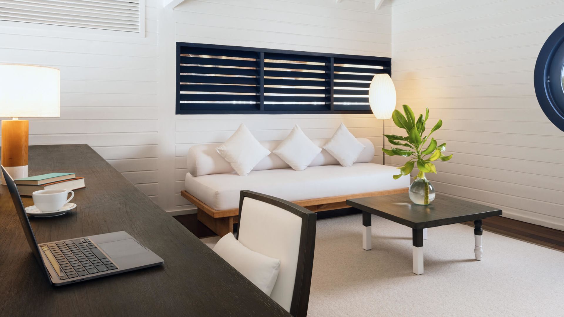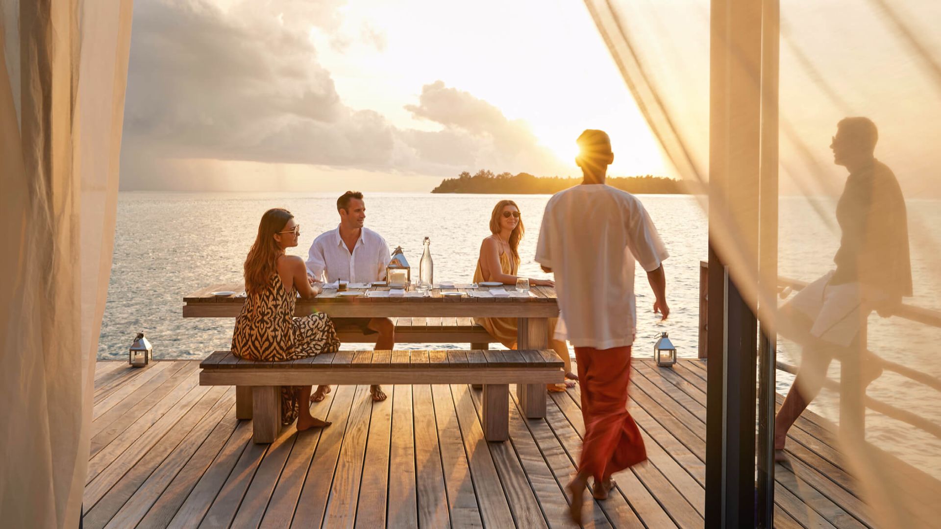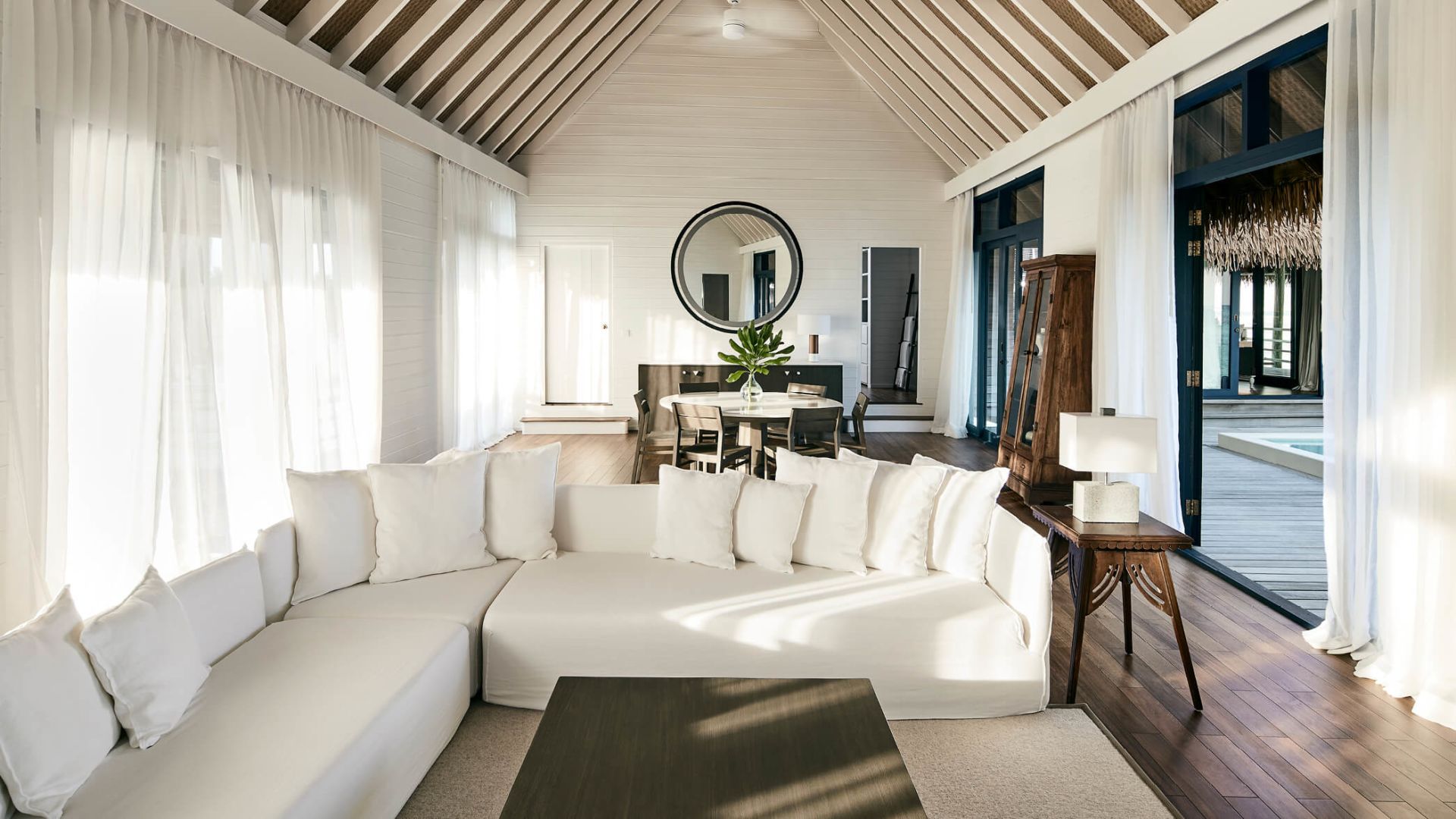 两卧室拥有独立的别墅,每个别墅都设有一间连接卧室和一个直接位于海洋上方的私人露台。共享的生活区和用餐区连接,两侧都有阳台,让您直接从甲板上步入绿松石泻湖。还有一个隐蔽的甲板,还有一个新的私人游泳池,几乎可以接触到海洋的边缘。它非常适合家人和朋友。