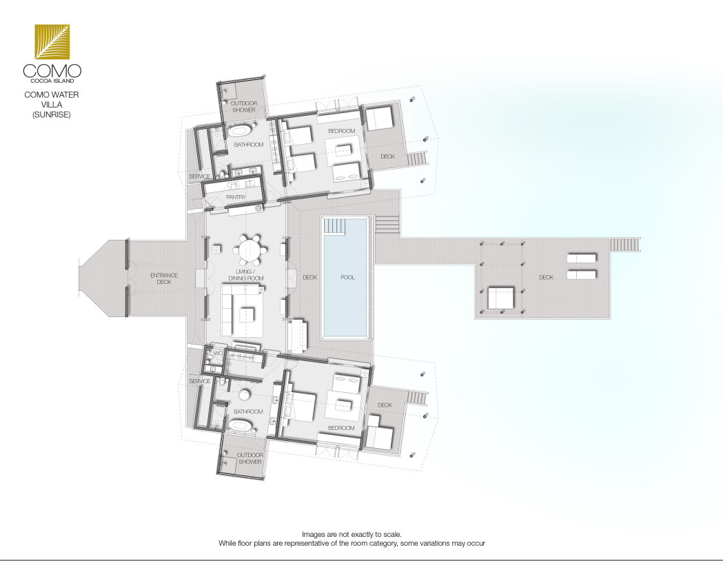 房型介绍:多尼套房的复式卧室设有一张特大床或两张单人床。宽敞的起居区一直延伸到个人专享的日光甲板, 这里放着两张睡椅和一个餐桌, 可以直接下到礁湖。