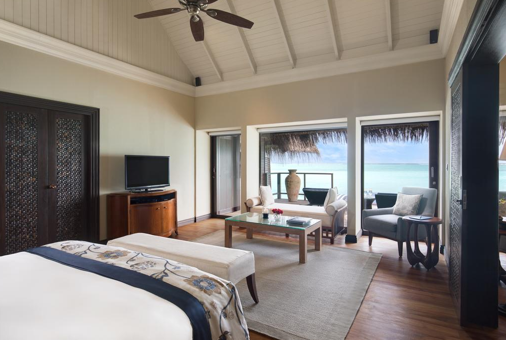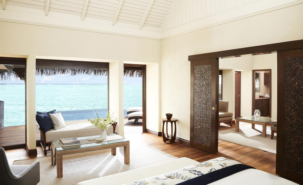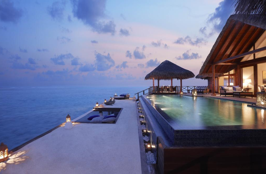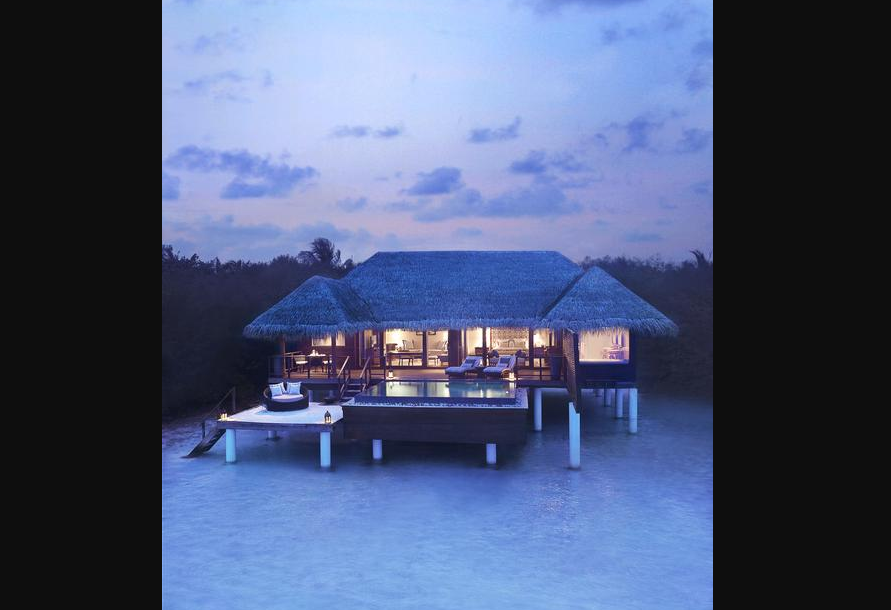 这是最豪华、最私密的房型。面积500平米,1个起居室,主卧有2个卫生间和1个阳台,1个客卧,1个玻璃浴室可以远眺印度洋,18米的游泳池,1个日光浴甲板,2个凉亭可以在此用餐、玩耍。