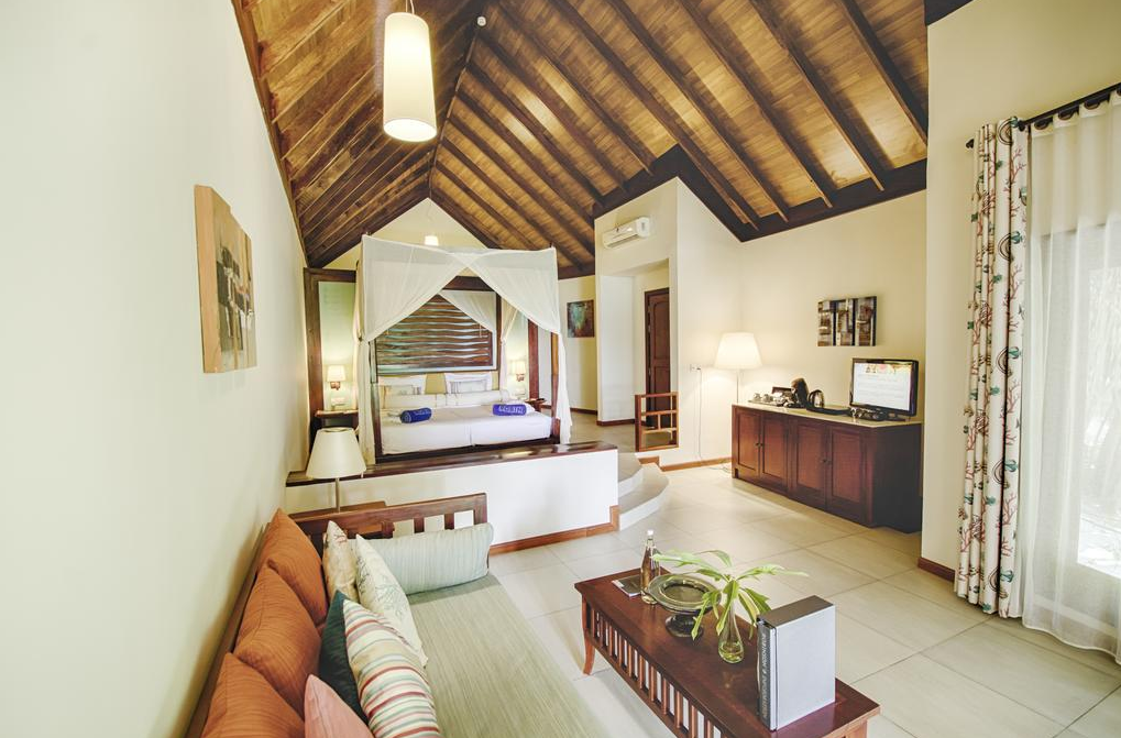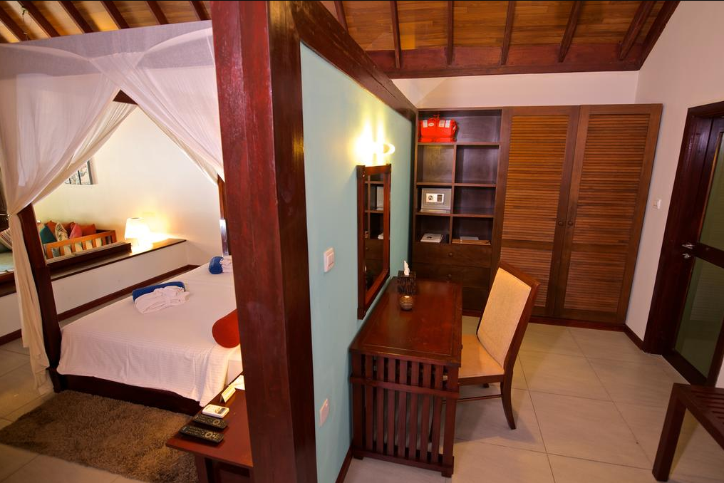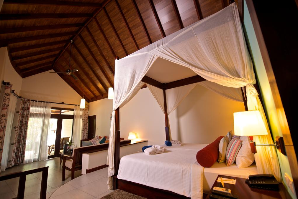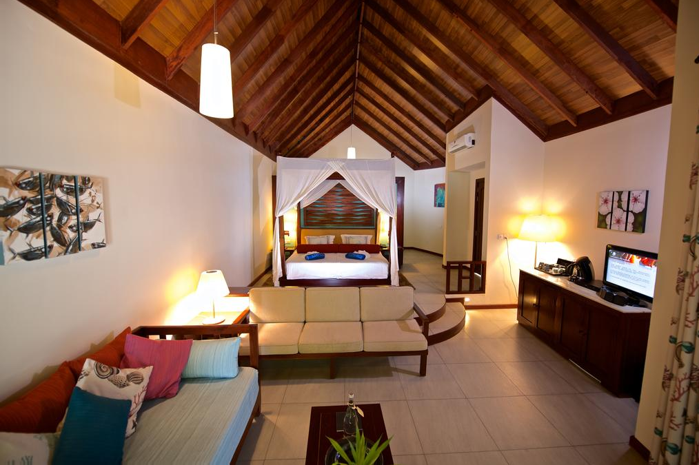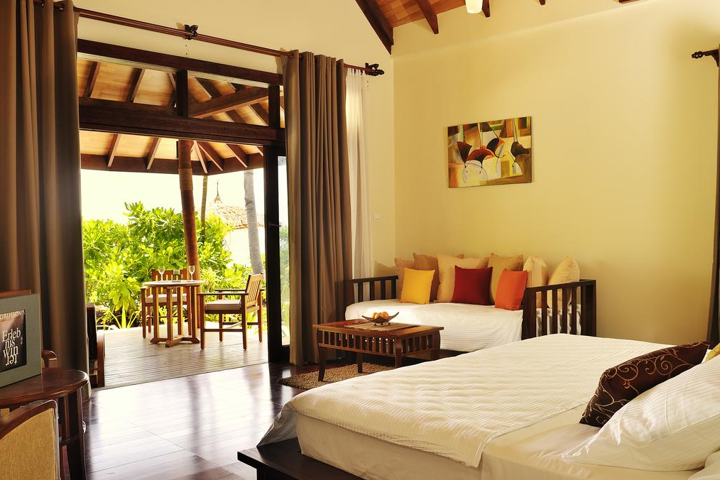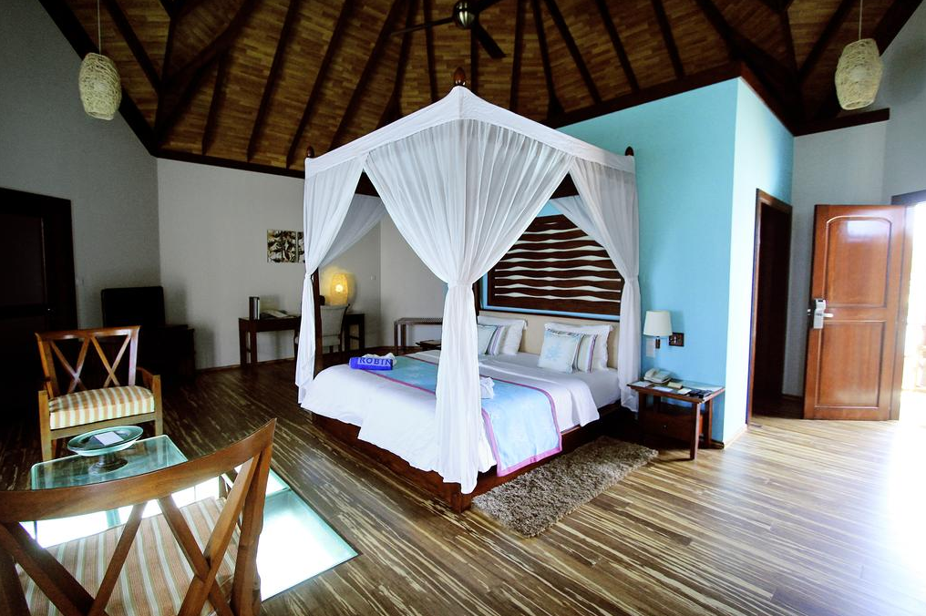 房型介绍:座落在水边,宽敞的平房可感受到海洋微风,中规中矩的沙滩屋,和卡努呼拉岛沙滩屋很类似,但价格便宜多了。 所有沙滩房型前面都有低矮植被,视线要越过植被才能看到大海。