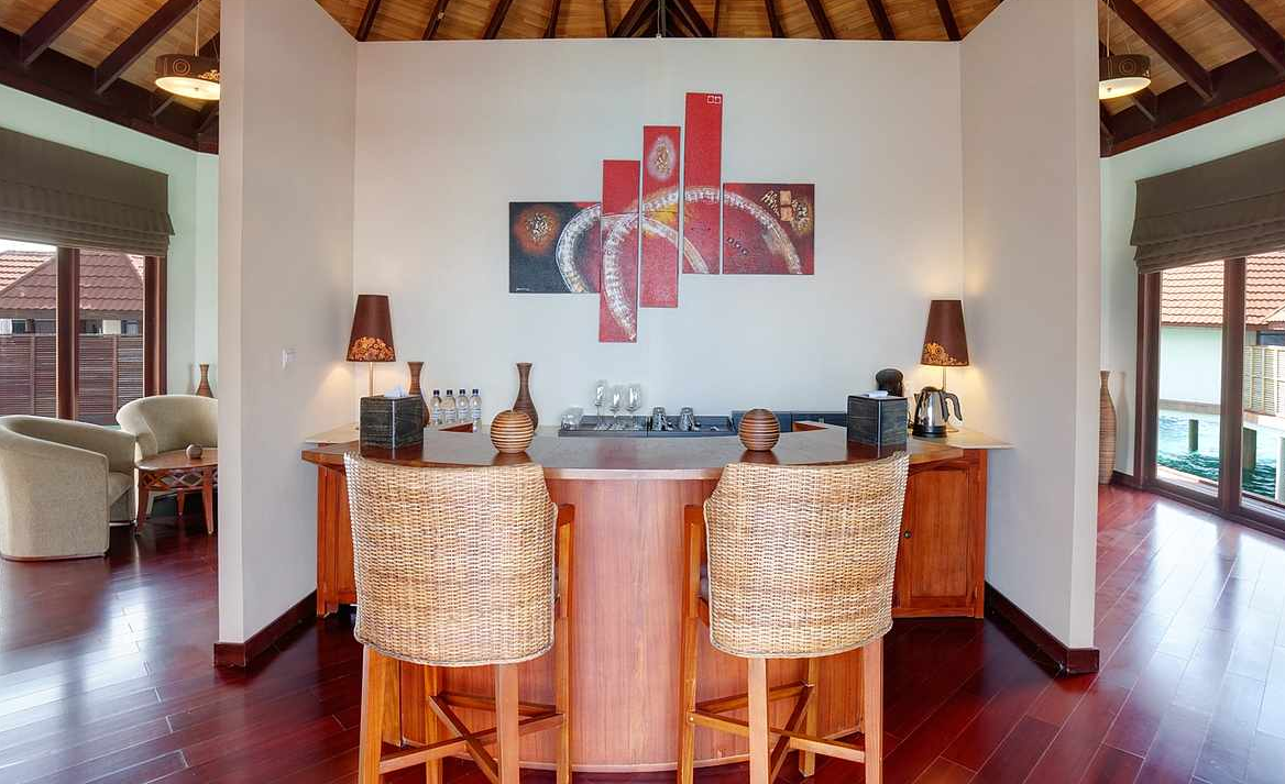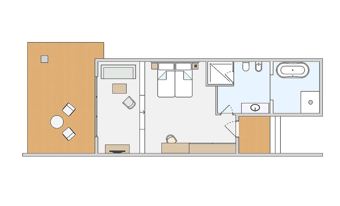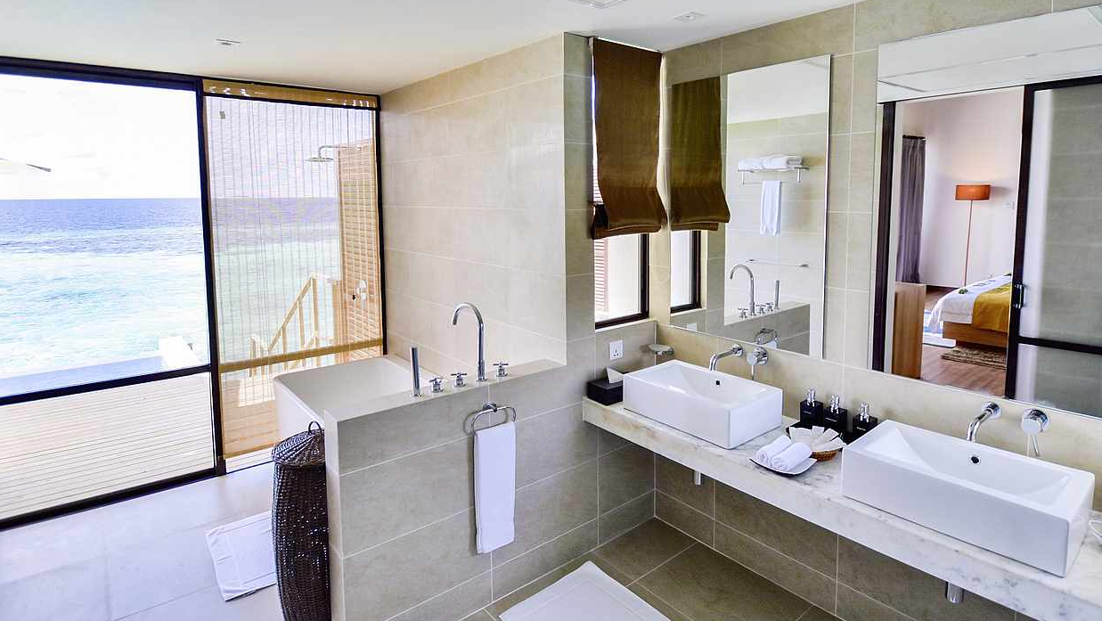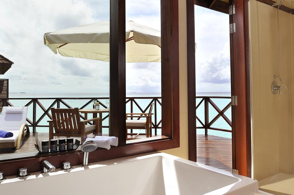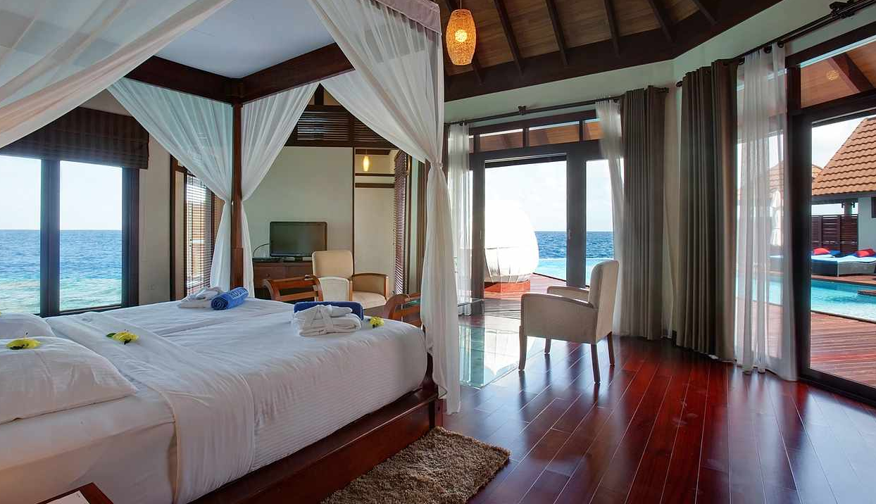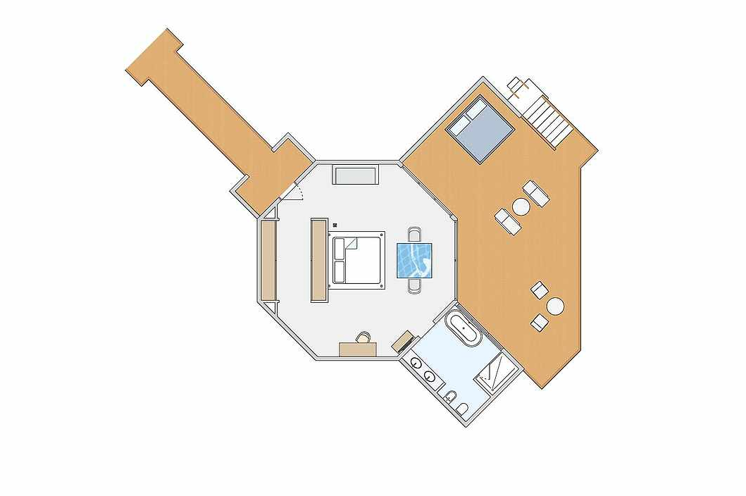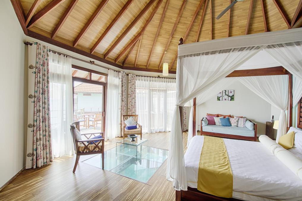 房型介绍:新增了一面玻璃地板您可以通过它直接欣赏到绚丽缤纷的海底生物。另外还有私人阳台的您还可以享受无限美好的下午时光或是走上几步去感受湛蓝的海水。房间内还设置了迷你酒吧,还增添了按摩浴缸。