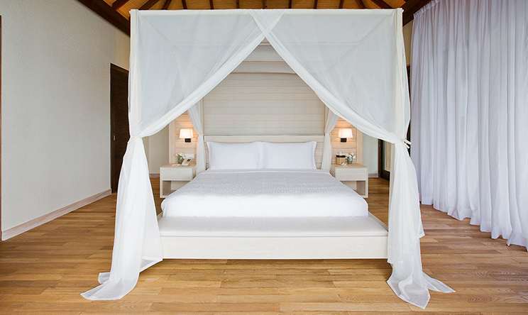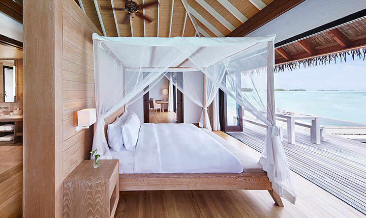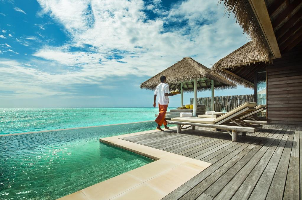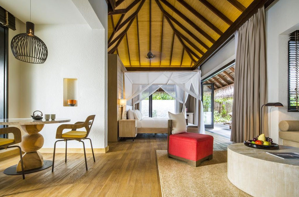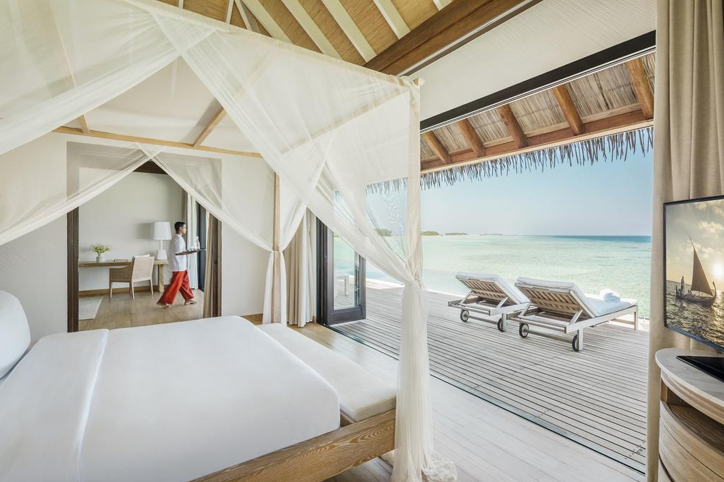 房型介绍:每间宽敞的水上泳池别墅都带有私人泳池、日光露台和落地窗,可眺望蔚蓝浩瀚的印度洋。卧房有专门的更衣室,浴室内有一个埋入地面的浴缸和户外淋浴房。休息区宽敞明亮,通风良好,兼具儿童卧房的功能。