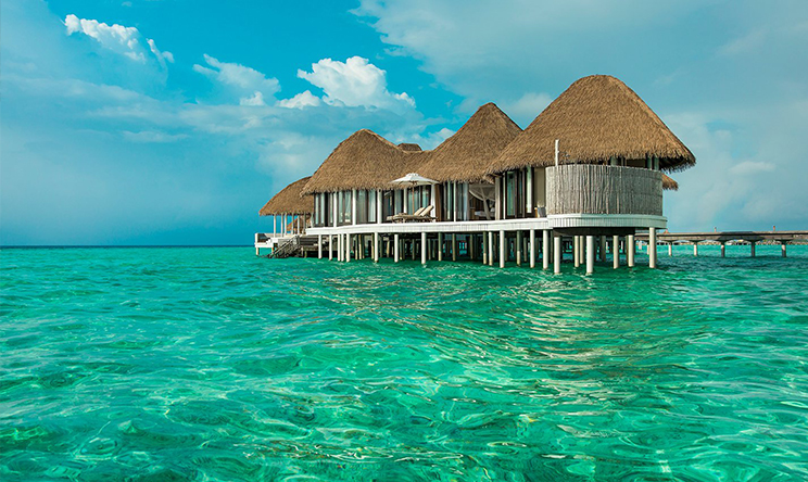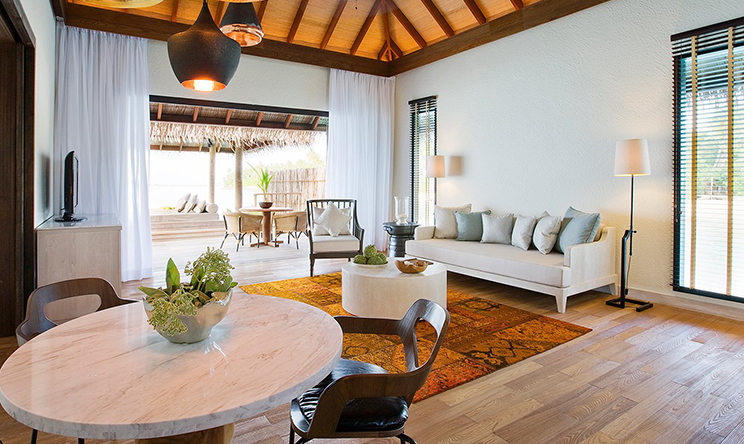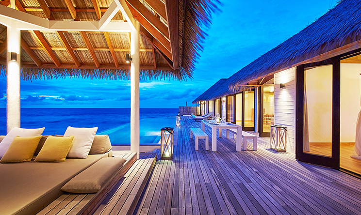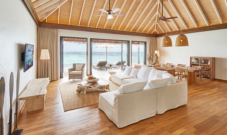 Maalifushi水上别墅,这是度假村最壮观的水上别墅之一:一个超大的两间卧室,明亮的平房,设有一个私人游泳池和日光浴平台。