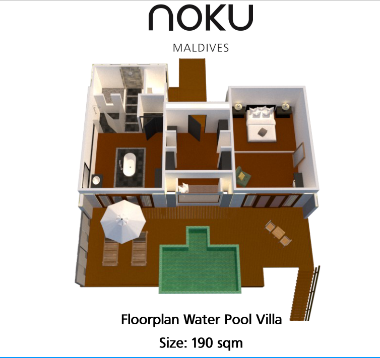 别墅坐落于泻湖之上,设有一座大型私人游泳池,配有壮丽景观的开放式卫生间,提供行政休息室。 泳池面积:6米长x3米宽x1.2米深
