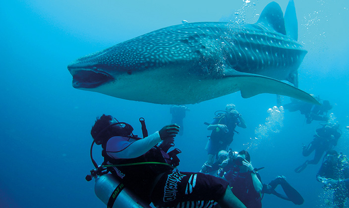 ③. 被公认为是世界上最好最大的潜水点之一,浮潜装备免费租借,拥有多达50多个潜水点,处在最佳观赏鲸鲨的环礁,一年中有10个月能看到鲸鲨!。