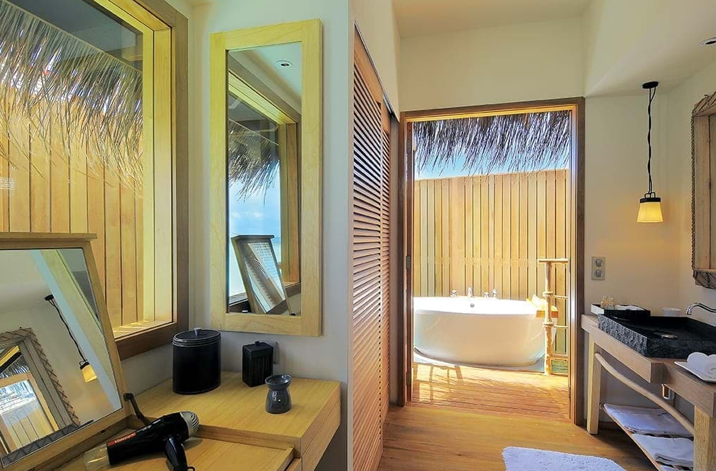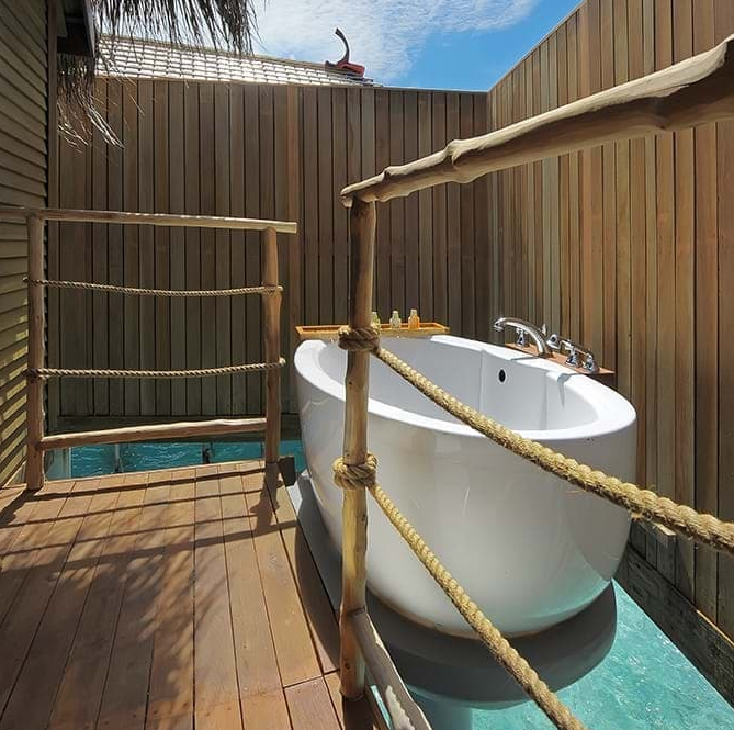 房型介绍:每个日出日落,每个白昼黑夜和深爱的人在一起,品一口红茶,看一看美景,可谓是增添一番异域的浪漫。并且设施齐全,特别还新增了木质阳台和吊床,在这里您可以充分的感受到来自热带海洋世界的别样热情。 和water villa的区别: 1.房间比普水多一个浴缸 2.另外有一面墙的挡板是可以拉开的 3.高级水屋配备了Nespresso的咖啡机 4.空调也是中央空调 & water villa是壁挂式空调