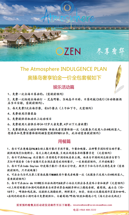 ②. 实行一价全包的方式经营。即包含每日三餐、酒水饮料、部分活动(出海浮潜&60分钟SPA赠送&部分水上活动)。就餐:可自行选择在马尔代夫餐厅,北京餐厅,印度餐厅。