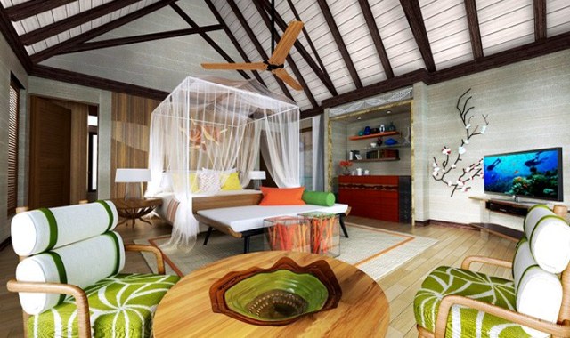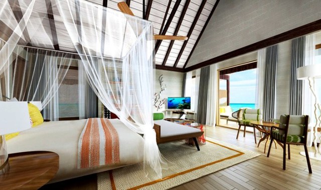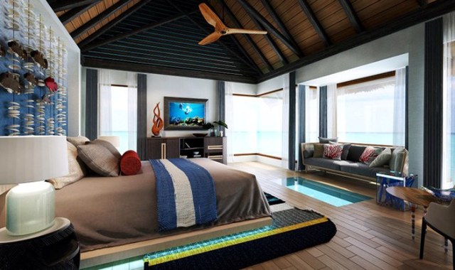 本套奢华套房坐落于奥臻岛最顶端,揽尽马尔代夫的无敌美景。套房共设有三间卧室,每间都设有独立浴室。套房同时配备了35平方米大的包含光纤氛围照明的超大泳池、私人健身房、设有独立出口的佣人房和一间露天用餐亭。引用定制奢华的理念,勘称最完美的水上套房!