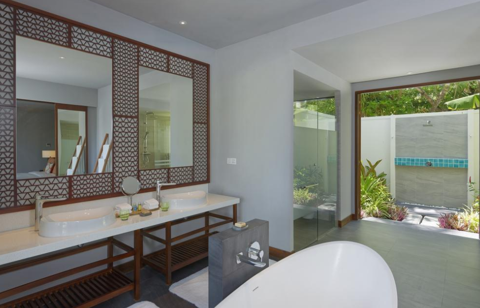 房型介绍:海滩别墅宁静而优美,浴室设有室内室外空间,充满乡土植物的气息,还配有淋雨花洒,长浴缸,别墅前有一张沙发椅和日光躺椅。