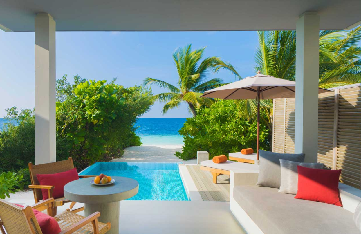 房型介绍:海滩泳池套房是浪漫情侣庆祝的最终隐居之所,这些豪华单卧室海滩别墅拥有独立的起居区域和超大泳池,浴室充满芳香气息,套房前可以欣赏透明水命和婴儿蓝般的天空美景。