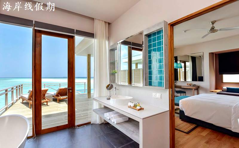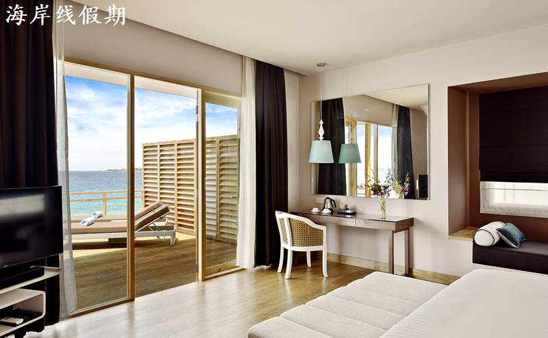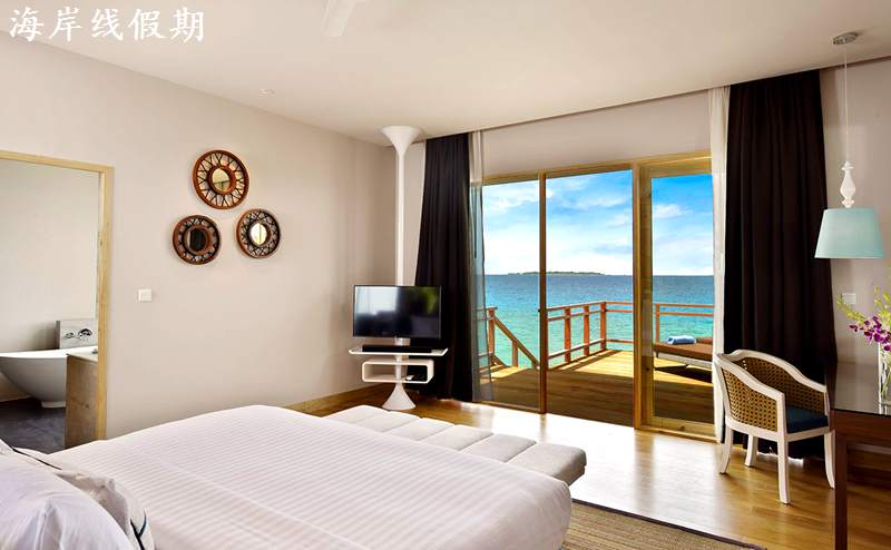 房型介绍:水上别墅建在波光粼粼的泻湖水域上,灿烂的天空下。