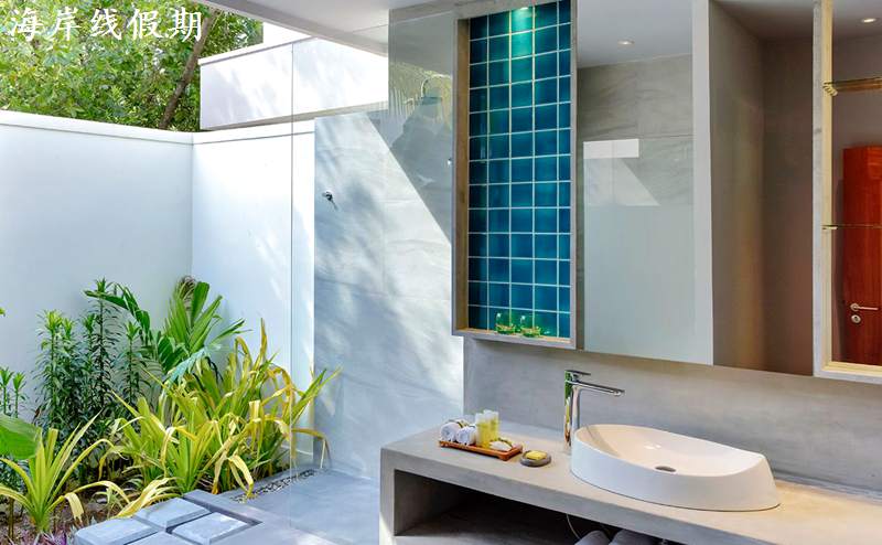 从海滩别墅望出去,可以看到闪闪发光的蓝绿色水域,浴室配有淋浴器、广阔的室外阳台、私人日光浴趟椅。