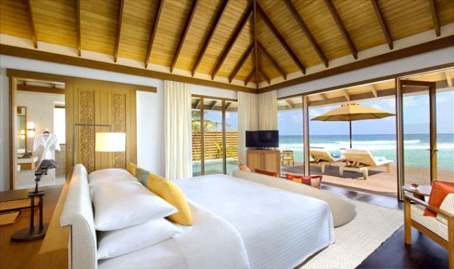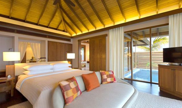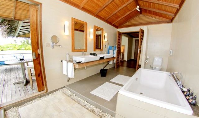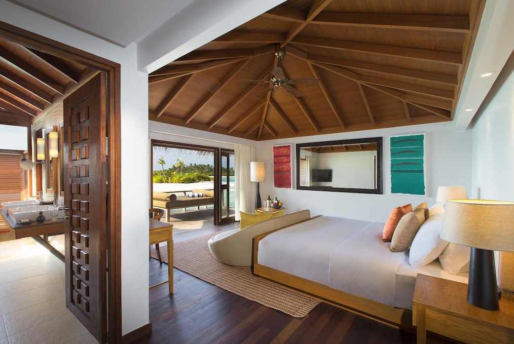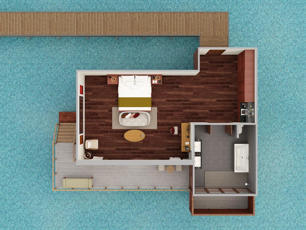房型介绍: 豪华水上度假小屋尽显豪华住宿体验。配有独立梳妆室和宽敞的室外私人平台;躺在私人小屋的日光躺椅上,饱览迷人的蔚蓝礁湖;浸浴在半户外双人水磨石浴池中,尽享舒适惬意。水上度假小屋均直接连接大海,室内装潢采用最精美的材料,将温柔婉约的小岛设计美学融入其中。
