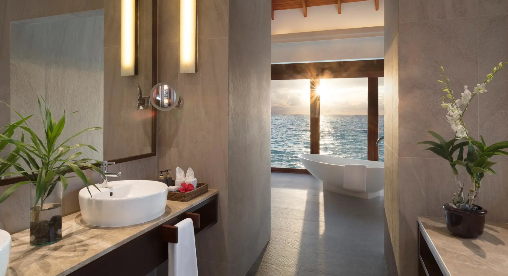 日出水上套房建于水晶般清澈的海面之上,在您的私人日光甲板上欣赏温暖的马尔代夫旭日在海平面上冉冉升起,或是打开套房的木框门,慵懒的躺在床上欣赏这一美景。无需潜入水中,透过浴室地板的玻璃观景窗即可...查看更多