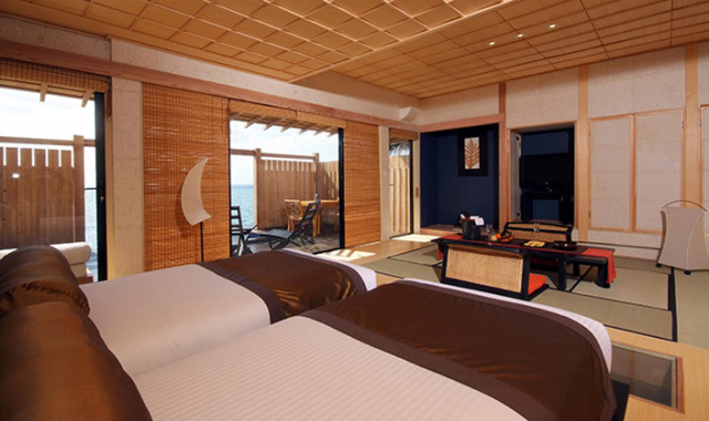 房型介绍:水上日式别墅以传统日本建筑为设计理念,以追求奢华、隐秘住所的宾客需求为标准精心构建而成。室内装潢的色调能够舒缓情绪,美观宜人,家具的位置经过精心摆设,散发出原汁原味的日本情调。滑入一件色泽鲜艳的和服,想像自己穿越到了古代日本居住冲绳海岸的传统民家。拥有宽敞走廊的日式别墅栖于瓦度岛绿松石般的水域上。