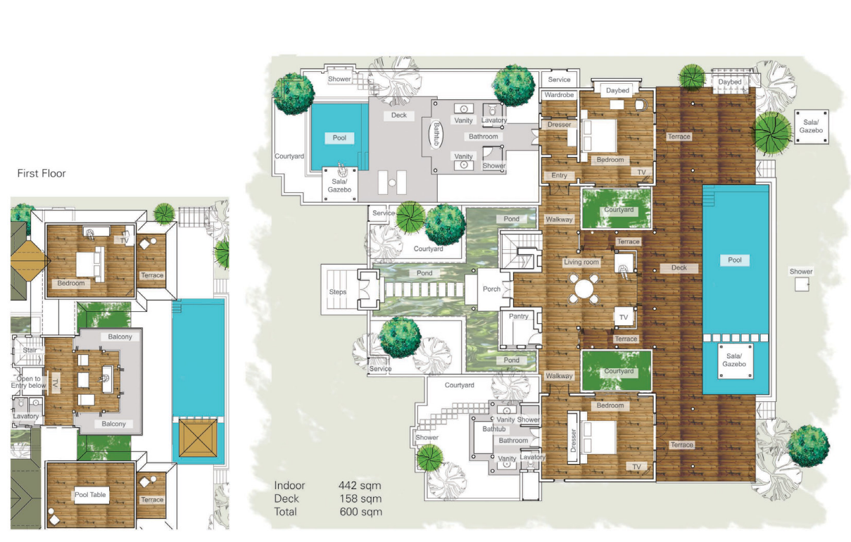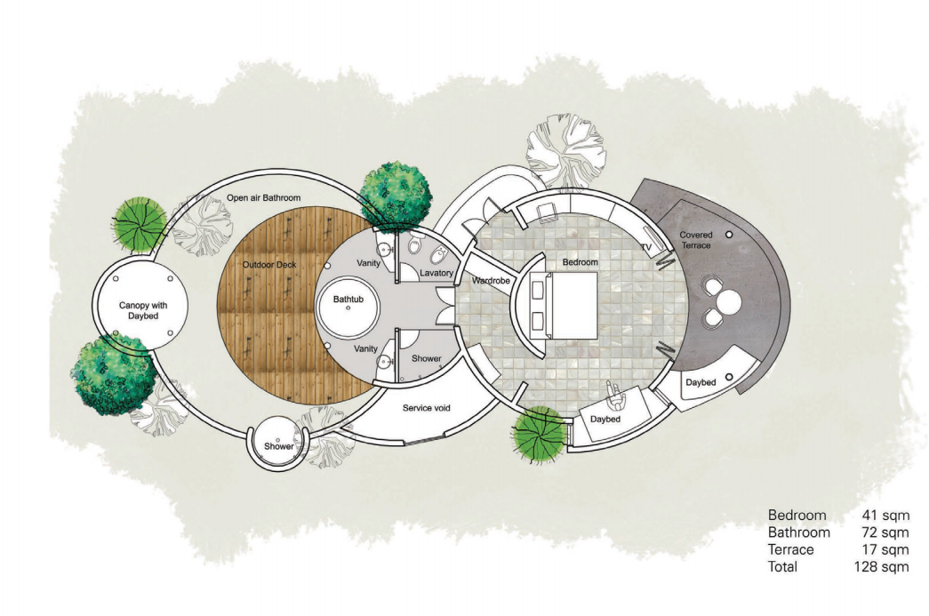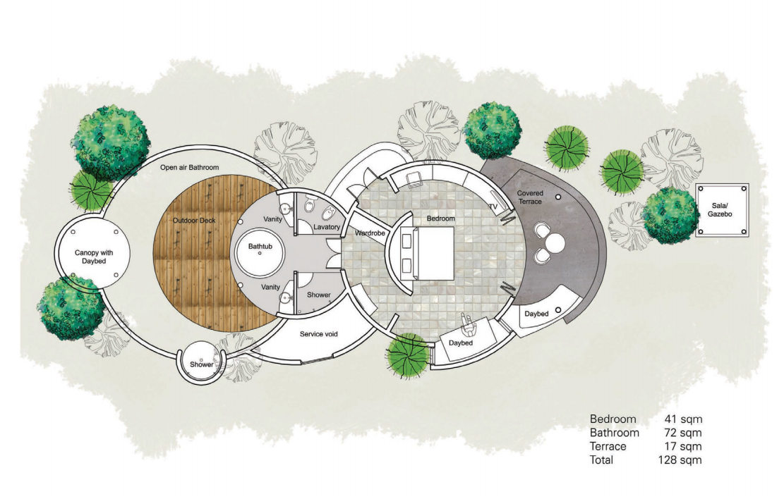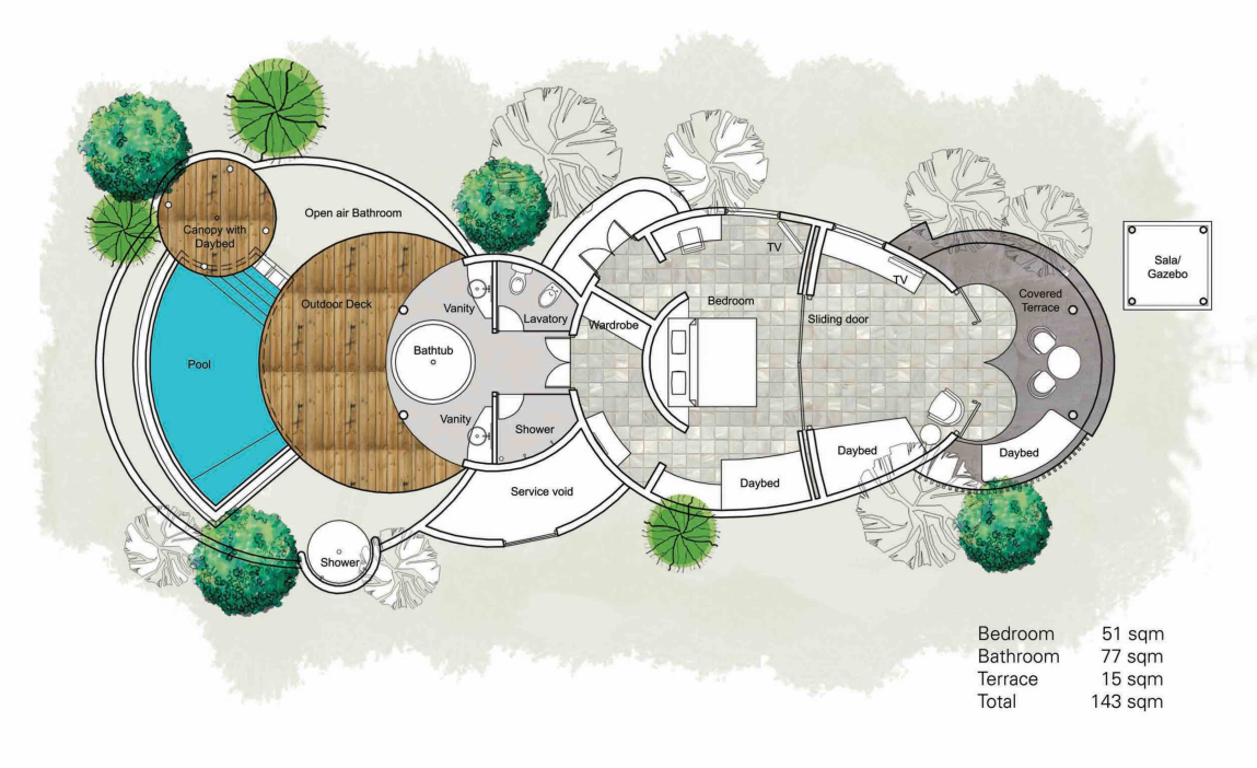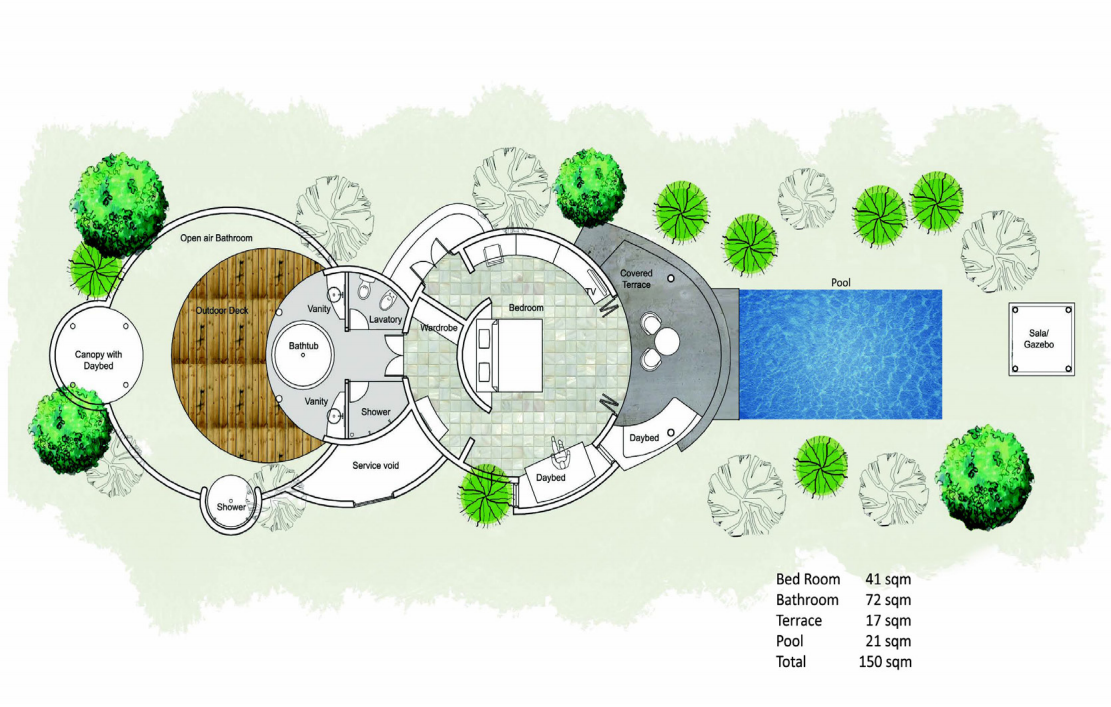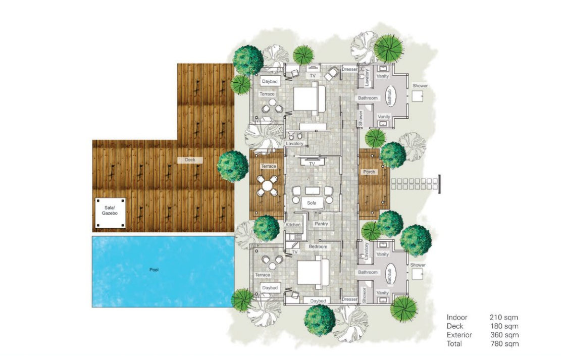 房型介绍:别墅有三间卧室,楼下的两间卧室都有自己的庭院,内设户外浴室,主卧室还有额外的惊喜,它带有一个私人游泳池和凉亭。 楼上的第三个卧室和所有其他卧室一样,带有露台,配备了躺椅。 宽敞的起居空间被分为两层,一个休闲空间通往主甲板,还有大型游泳池和水上凉亭。