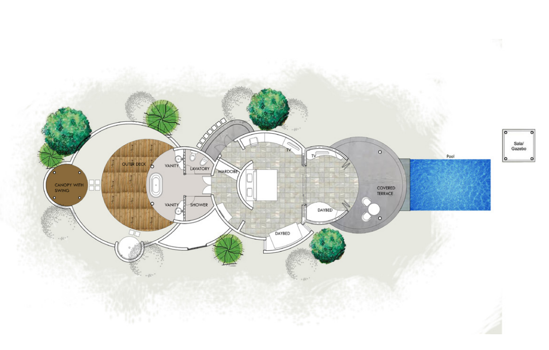 房型介绍:这座独一无二的建筑呈扇形对称分布,设有两间主卧室,进入中央起居区,高高的拱形天花板迎来凉爽的微风,这里通往有顶棚覆盖的甲板用餐区, 在悬臂支撑的无边际按摩浴缸观赏神奇的日出,其弧形边缘设计方便您饱览海洋全景。